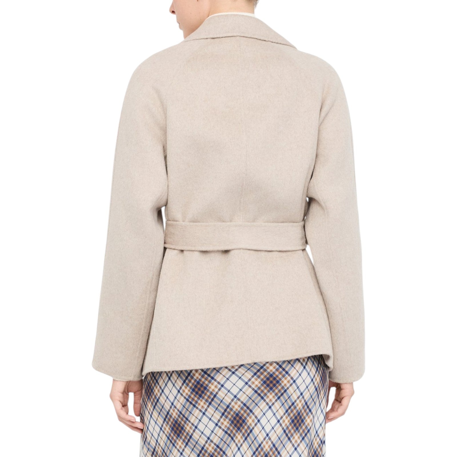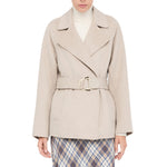 Cappotto beige. Realizzato in panno di misto lana. Collo a revers. Tasche sui lati. Cintura sur ton con fibbia d-ring in abbinamento. Chiusura doppiopetto. Fodera interna.