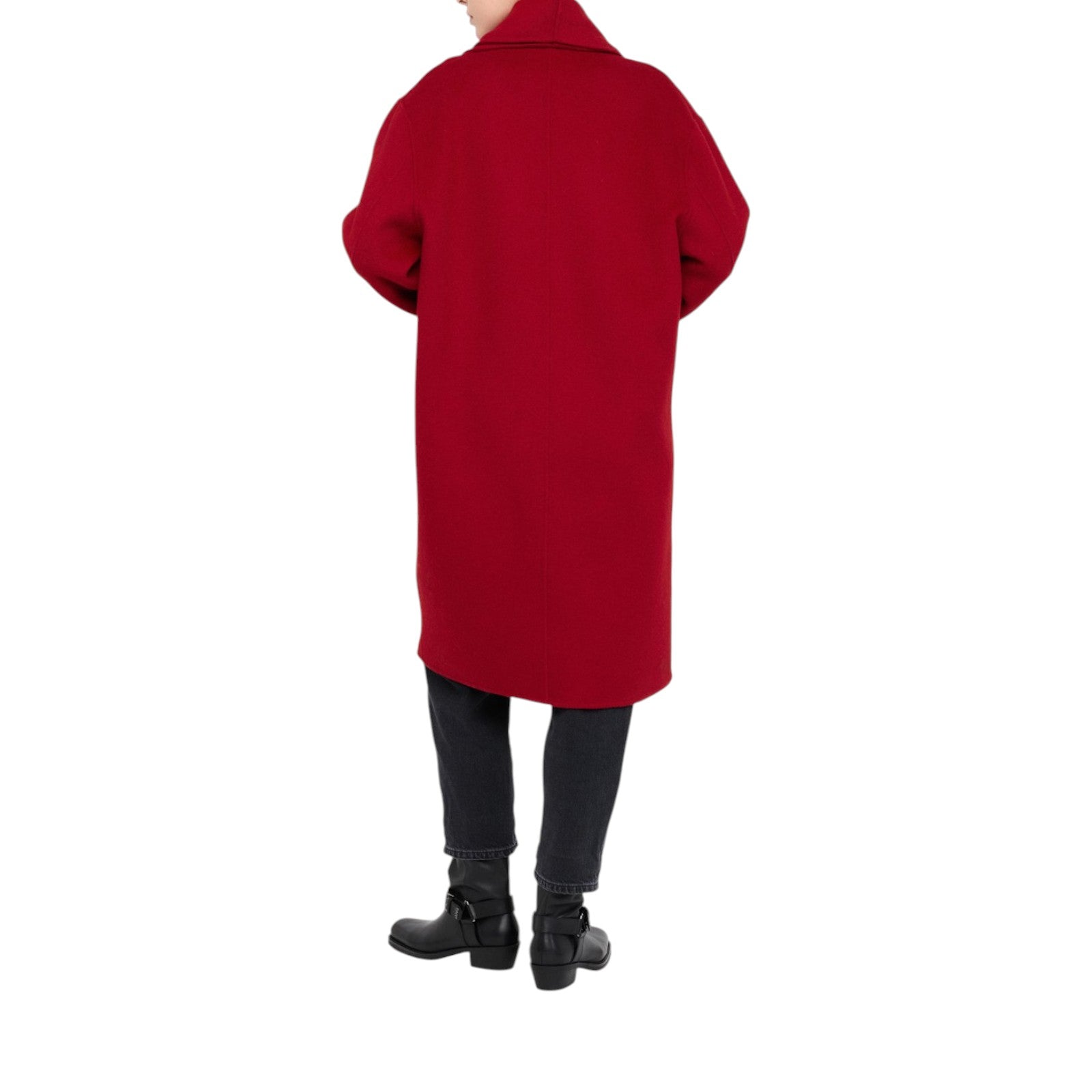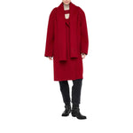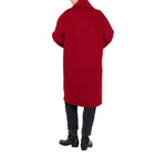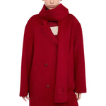 Cappotto rosso in panno double. Filati in misto lana. Rever classico. Comode tasche. Sciarpa con logo ricamato. Chiusura doppiopetto.