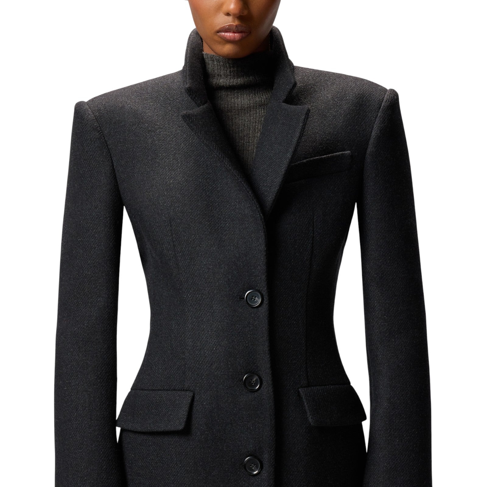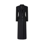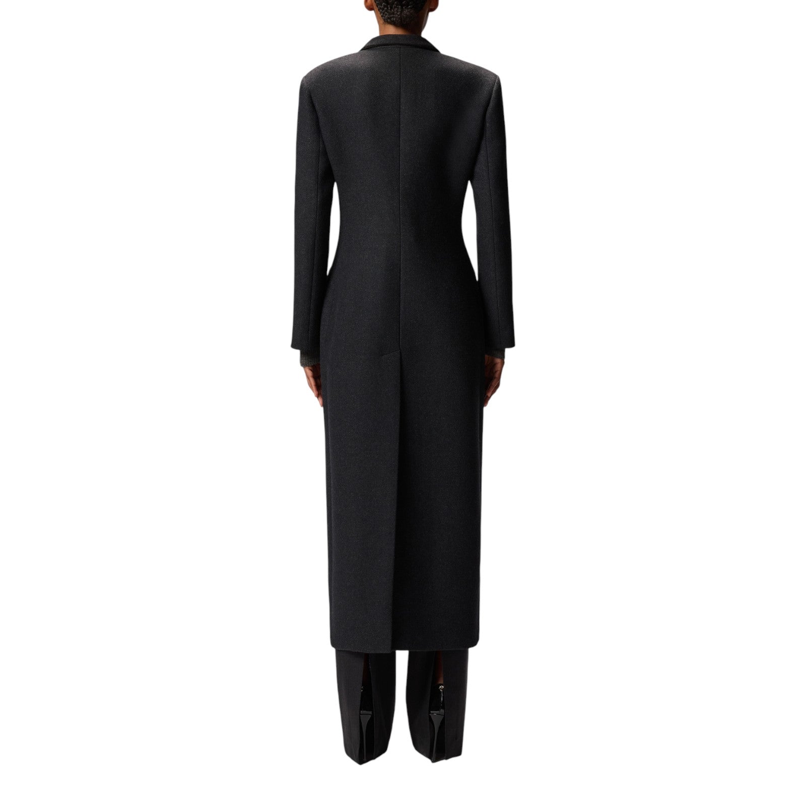 Cappotto lungo monopetto dalla linea sfiancata con collo a revers, spalle strutturate e tasche con patta, realizzato in morbido panno di misto lana. Il lungo taglio asimmetrico sul retro e l'abbottonatura decentrata sul davanti contribuiscono a rivisitare un design classico.