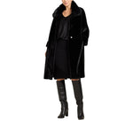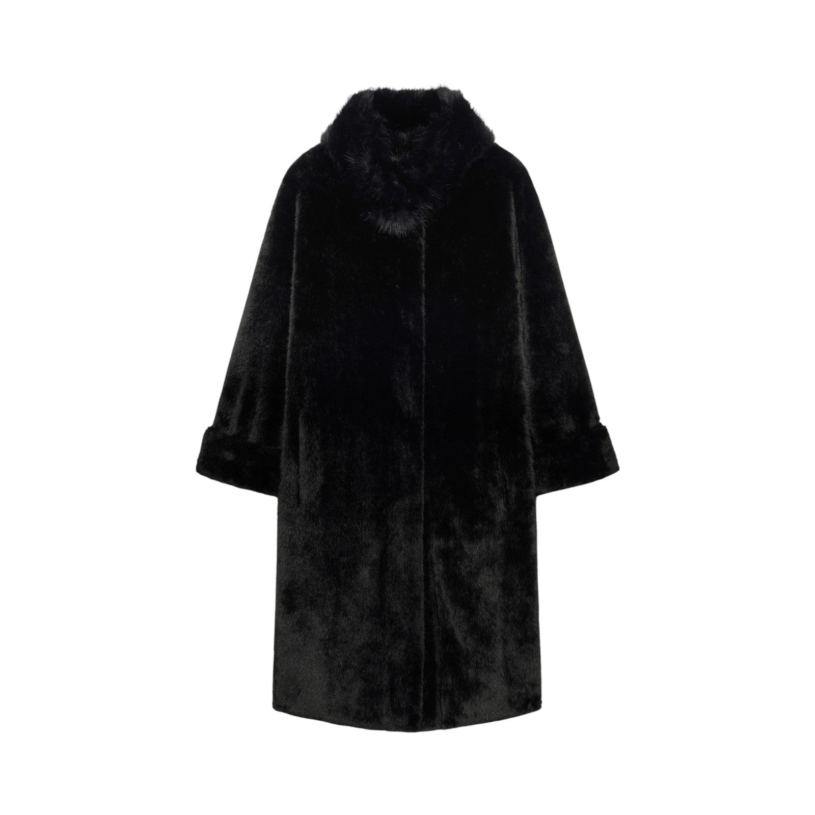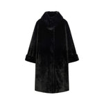 Cappotto dècontractè, realizzato in un soffice tessuto double face: dal lato esterno a pelo lungo ed internamente con effetto scamosciato. Linea morbida, collo in piedi, tasche, fondo manica con possibilità di risvolto, sfoderato.