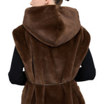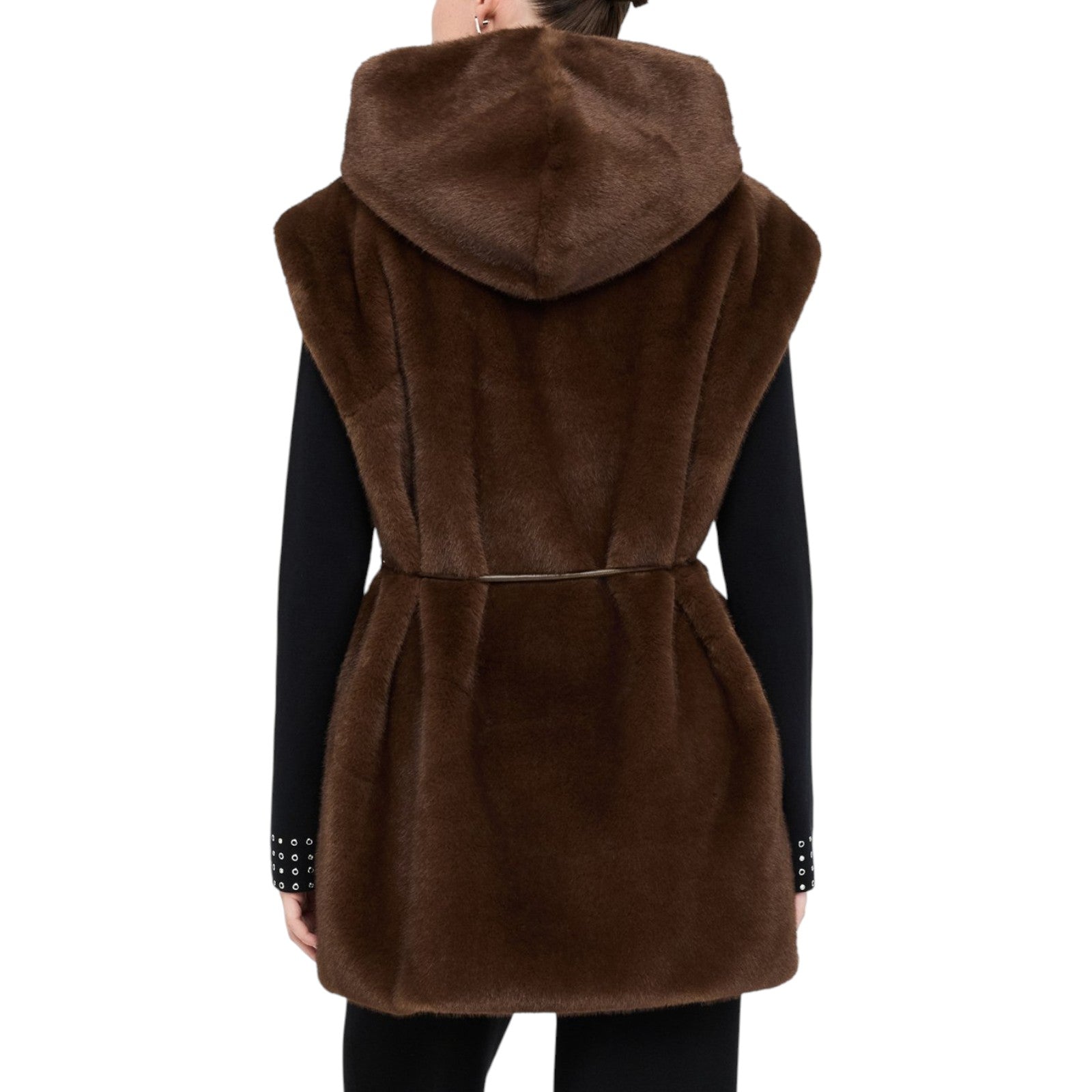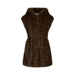 Morbido gilet in pelliccia sintetica. Trecce sul davanti. Cappuccio. Comode tasche. Cintura in abbinamento. Chiusura con bottoni a pressione.