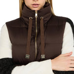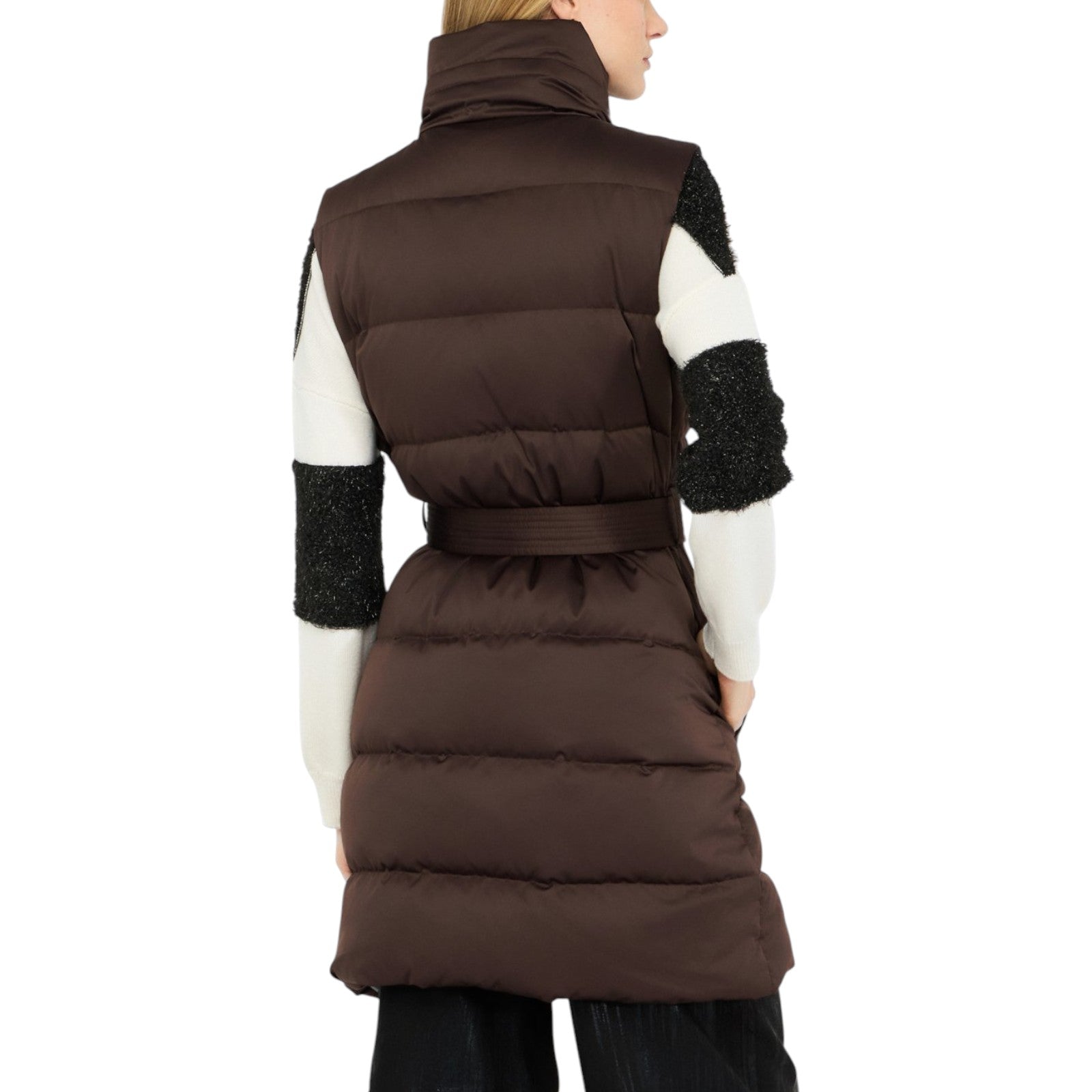 Gilet lungo in nylon trapuntato. Imbottitura in ovatta. Colletto con coulisse logata. Tasche con patta. Cintura regolabile in vita. La modella è alta 180 cm e indossa la taglia 40