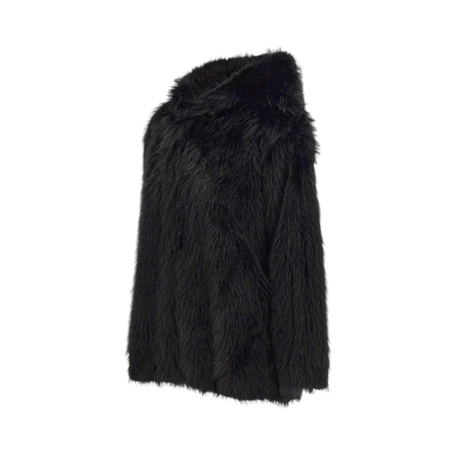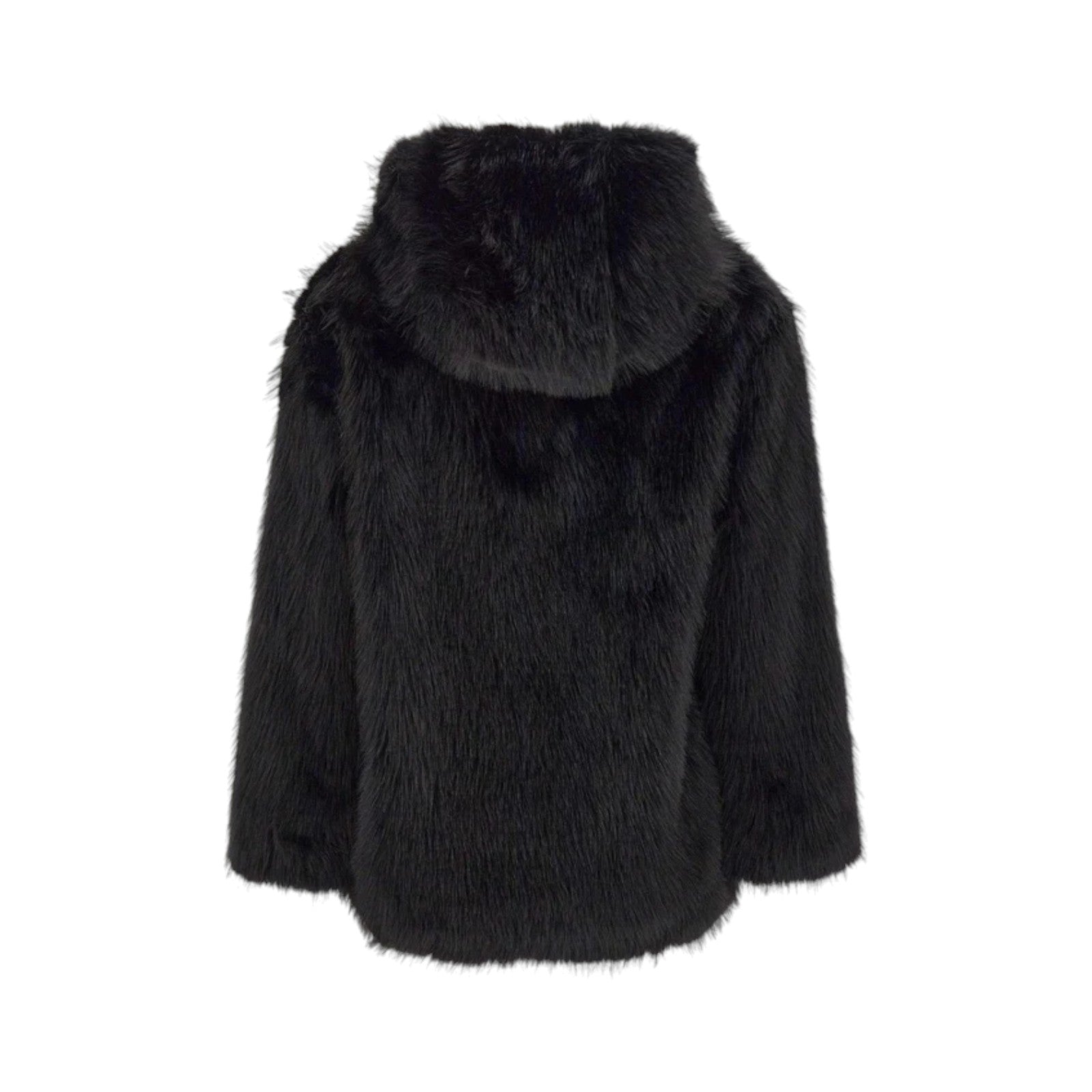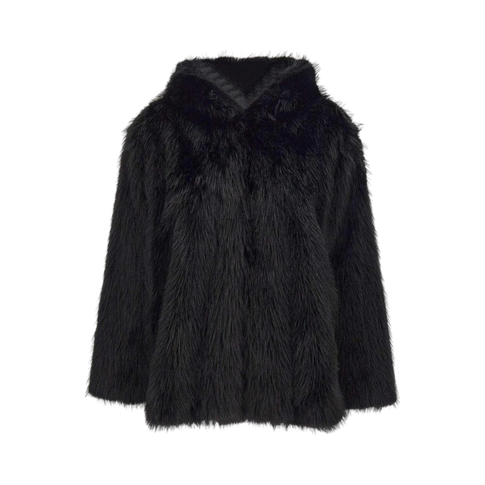 Pelliccia ecologica kaos in colore nero, caratterizzata da pelo lungo per un effetto avvolgente e sofisticato. modello con cappuccio, tasche laterali a filo e fodera tono su tono. vestibilità relaxed fit.