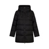 Piumino nero da donna in nylon trapuntato. Imbottitura in vera piuma. Cappuccio con ricami gioiello. Coulisse. Comode tasche. Chiusura con zip a doppio cursore. La modella è alta 178 cm e indossa la taglia 40.