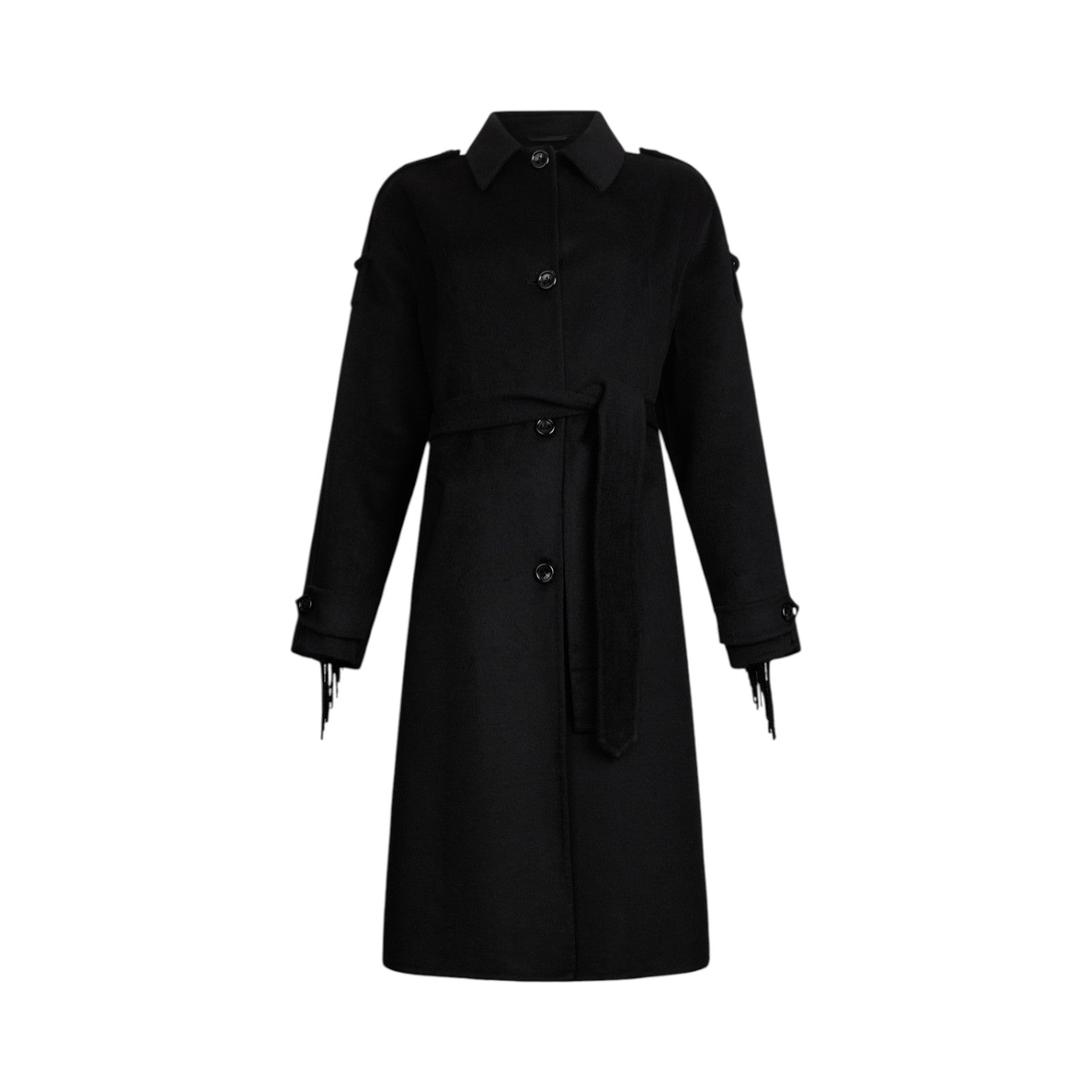 Trench in panno di misto lana. Frange sul retro. Collo a camicia. Mostrine sulle spalle. Polsi con cinturino e bottone. Tasche sui lati. Spacco sul retro. Cintura sur ton in abbinamento. Chiusura con bottoni. Fodera interna. La modella è alta 177 cm e indossa la taglia 40.