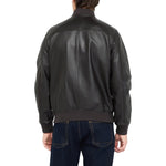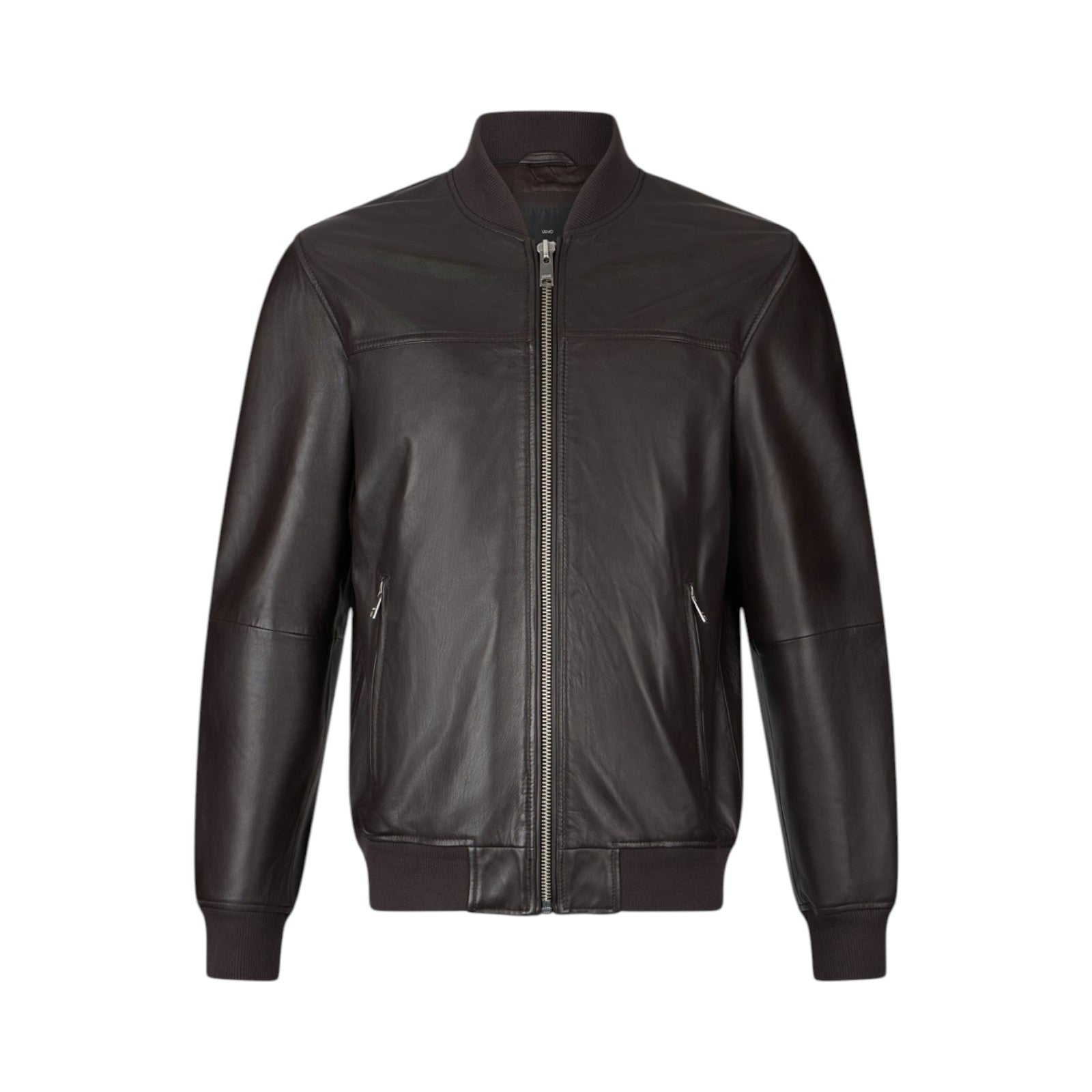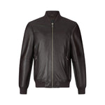 Bomber marrone in pelle. Collo, polsi e fondo in maglia a costine. Tasche con zip. Chiusura con zip.