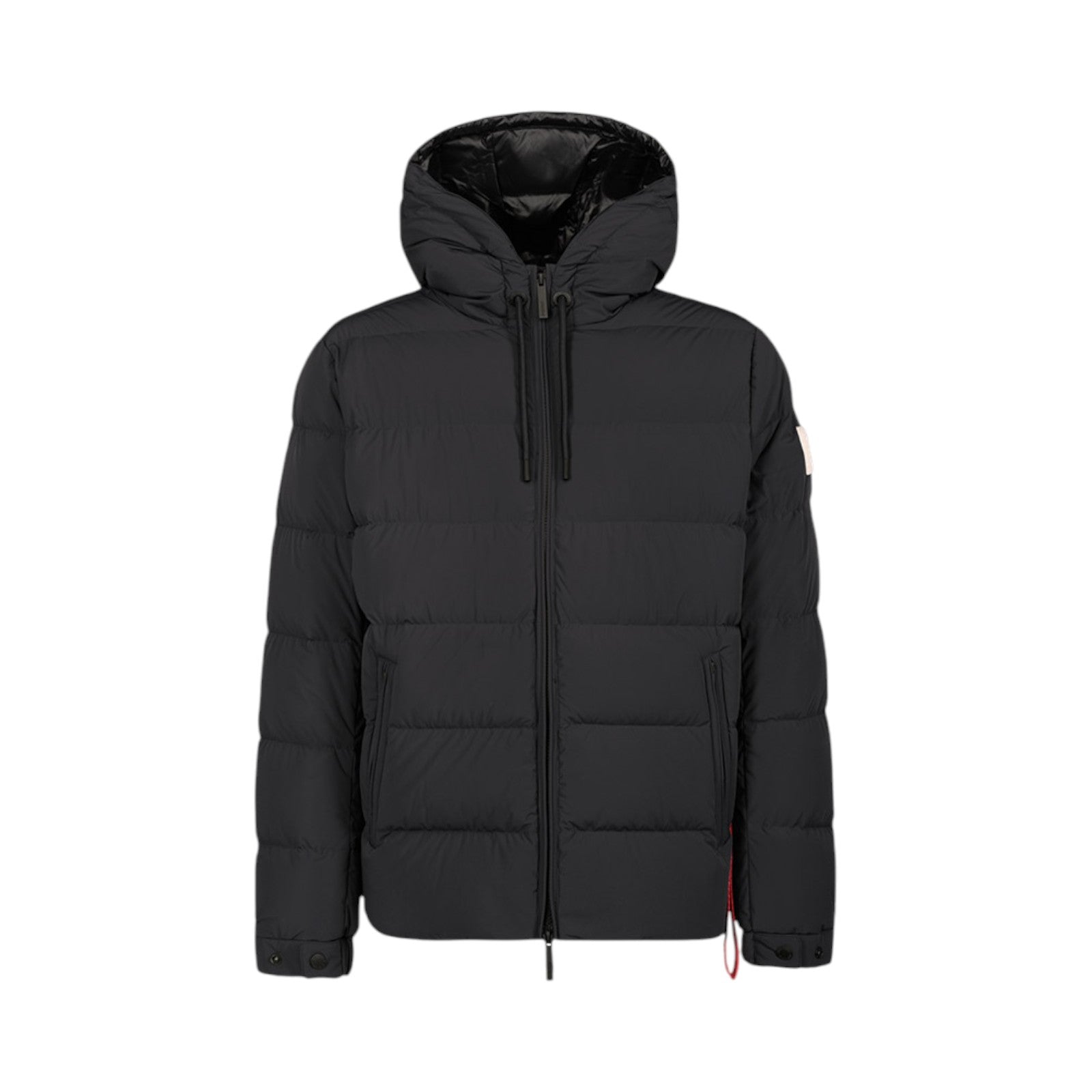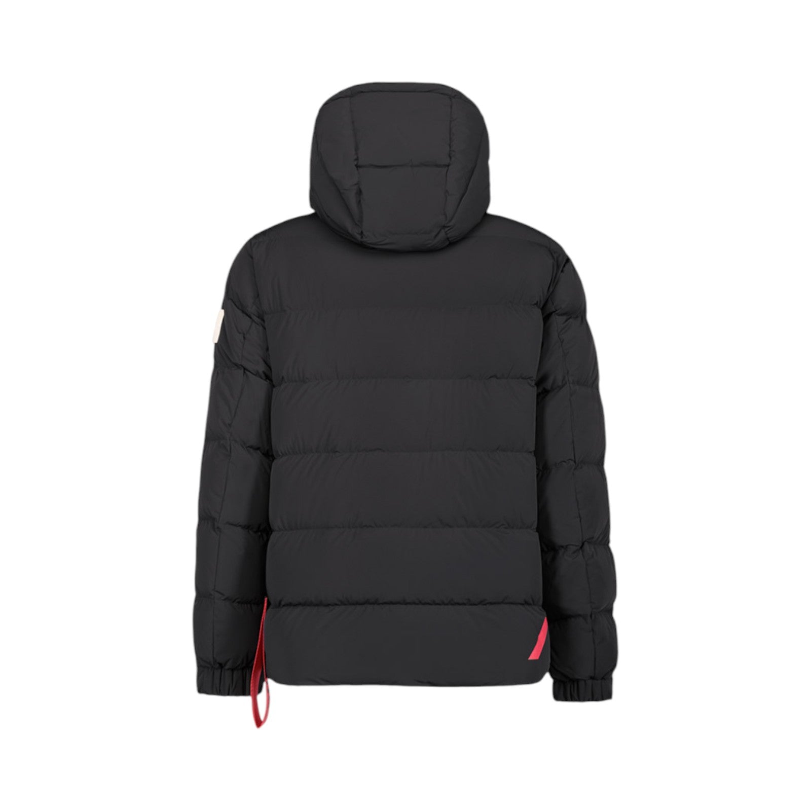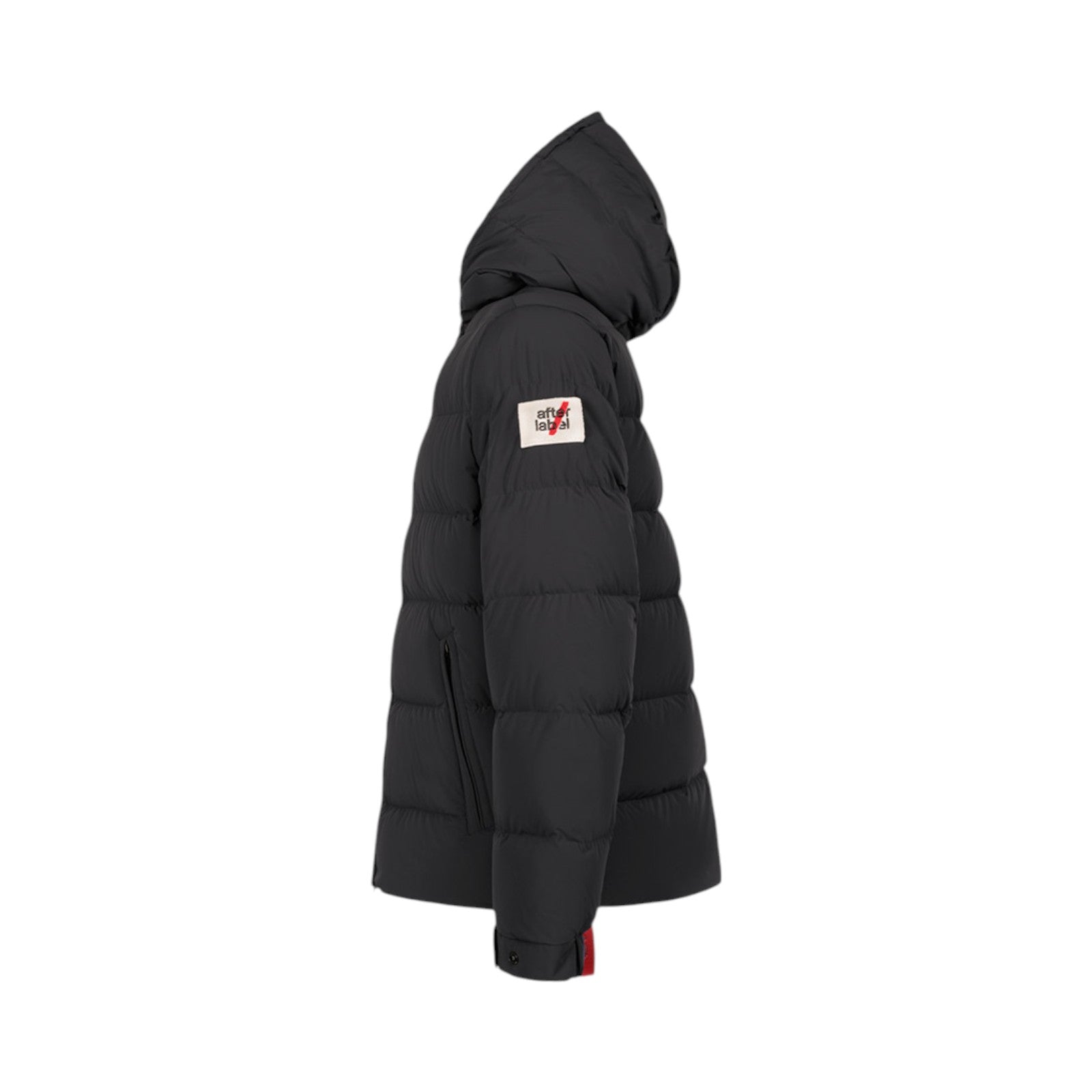 Realizzato in nylon stretch opaco; Chiusura anteriore con zip; Tasche frontali a filetto con zip; Cappuccio con coulisse regolabile; Patch After label su manica sinistra; Slash termoapplicato sul retro del capo; Pendaglio rosso portalogo After label.