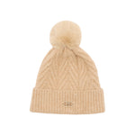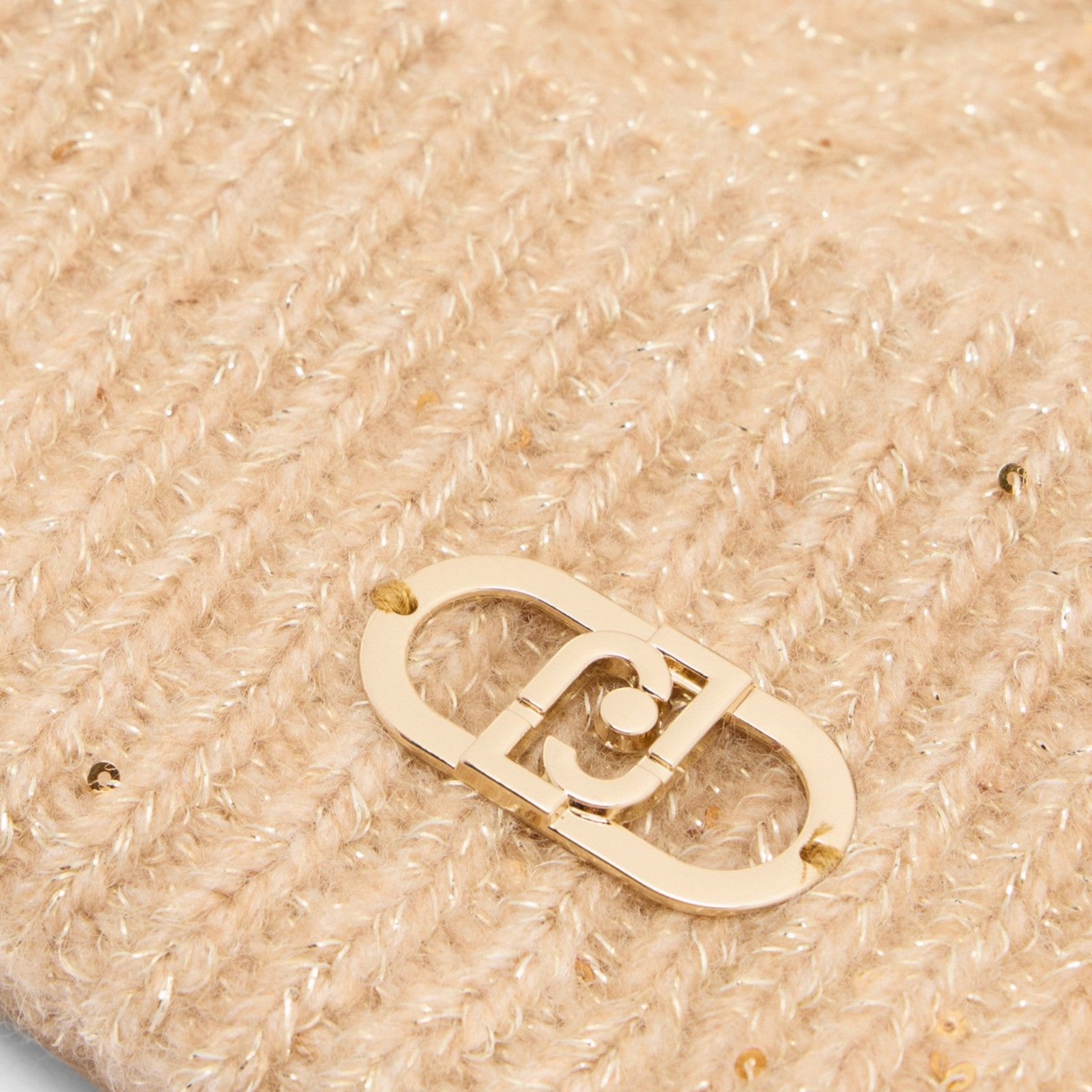 Berretto beanie beige. Realizzato in maglia di misto lana stretch. Interventi in lurex®. Pompon. Risvolto rifinito a coste. Logo in metallo.