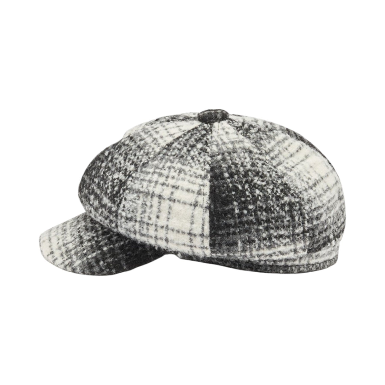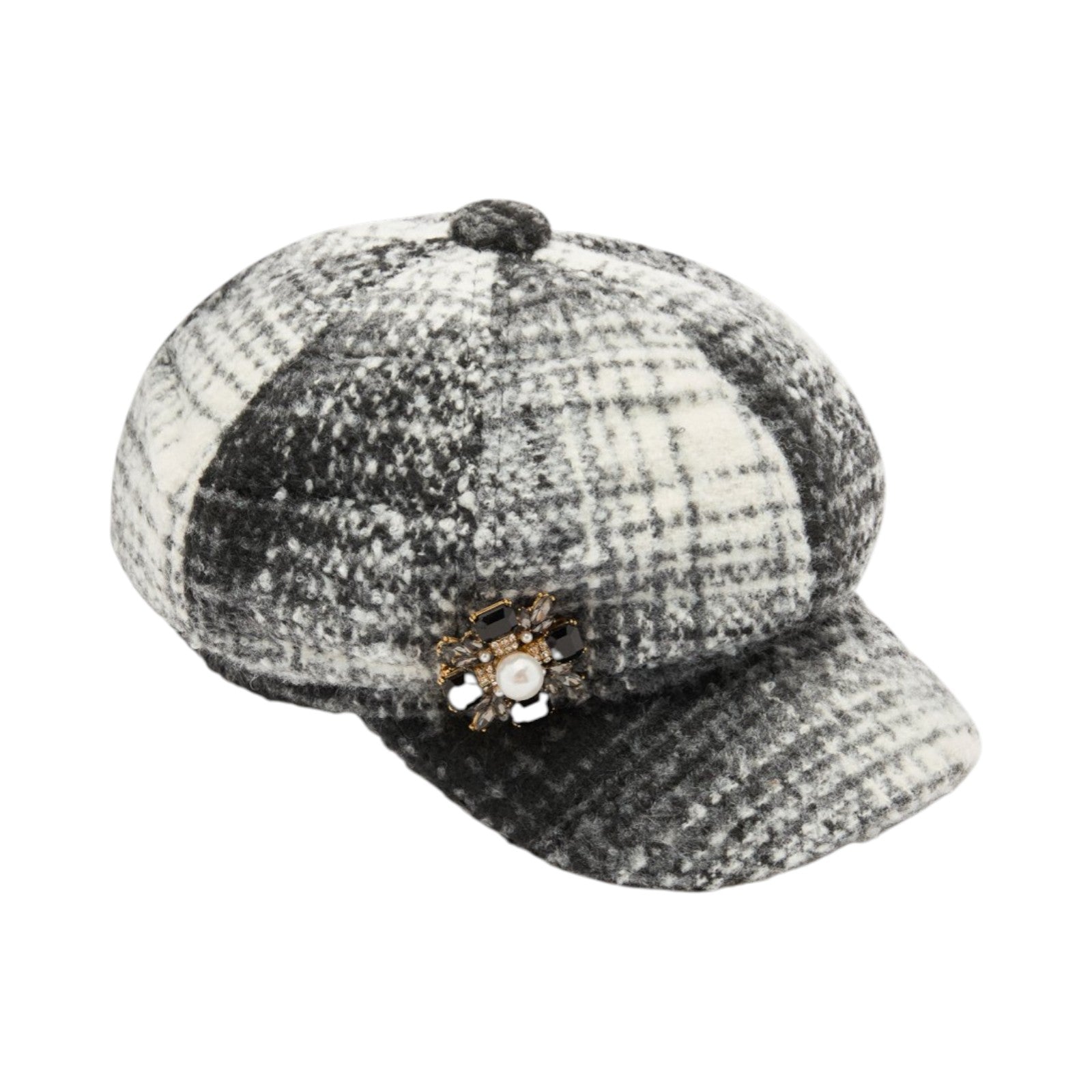 Cappello in tessuto check. Spilla con strass e perla. Visiera. Fodera interna.