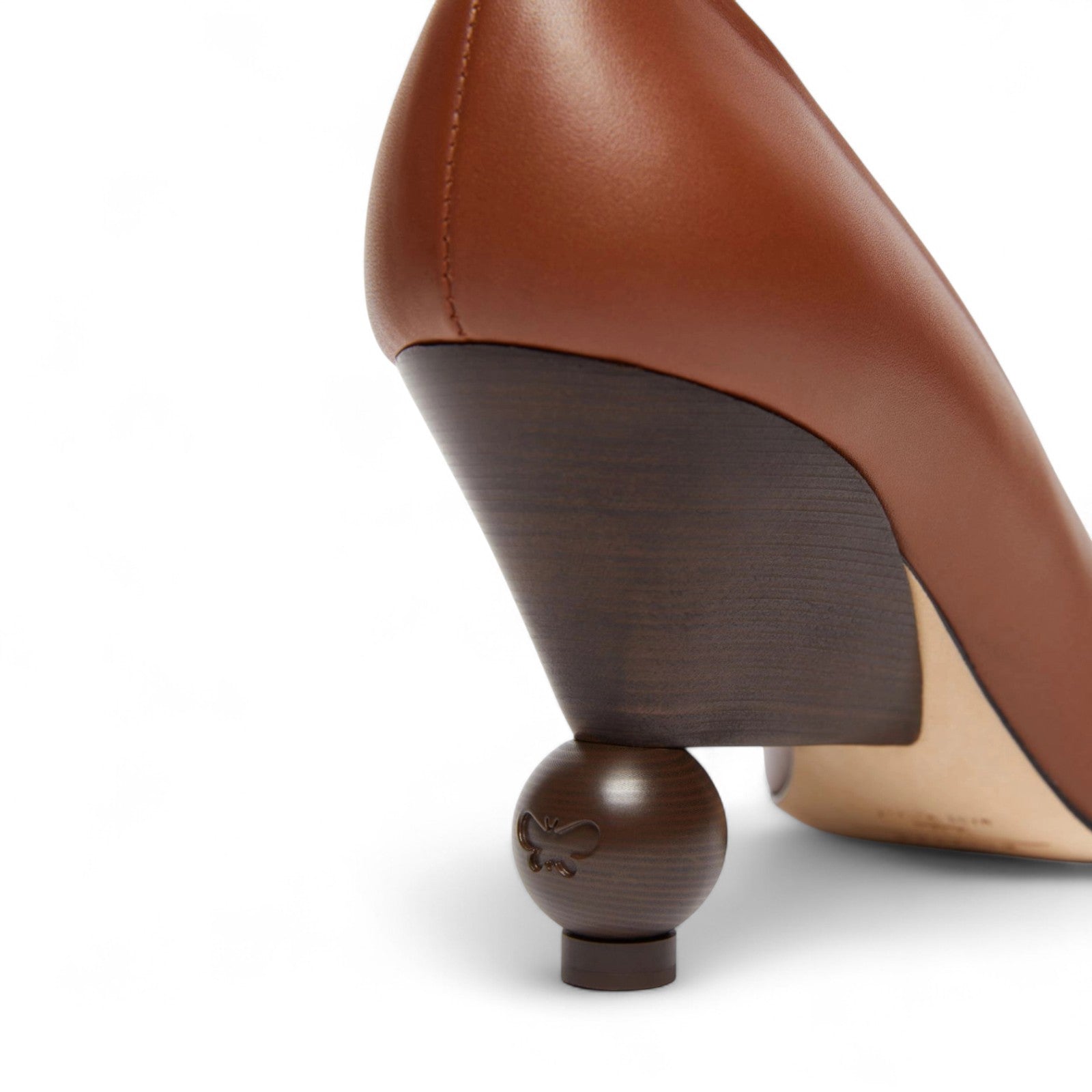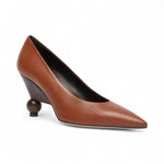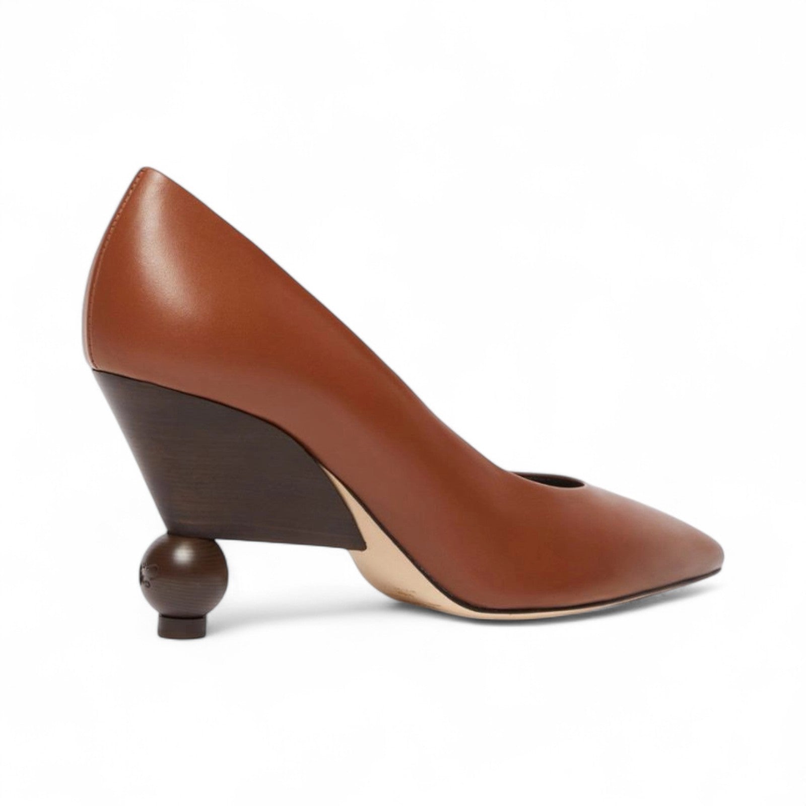 Décolleté in pelle di vitello. Finitura lucida con mano morbida. Fodera in morbida nappa di agnello. Tacco zeppa, tagliato lateralmente, boule e sottotacco. Suola in cuoio.