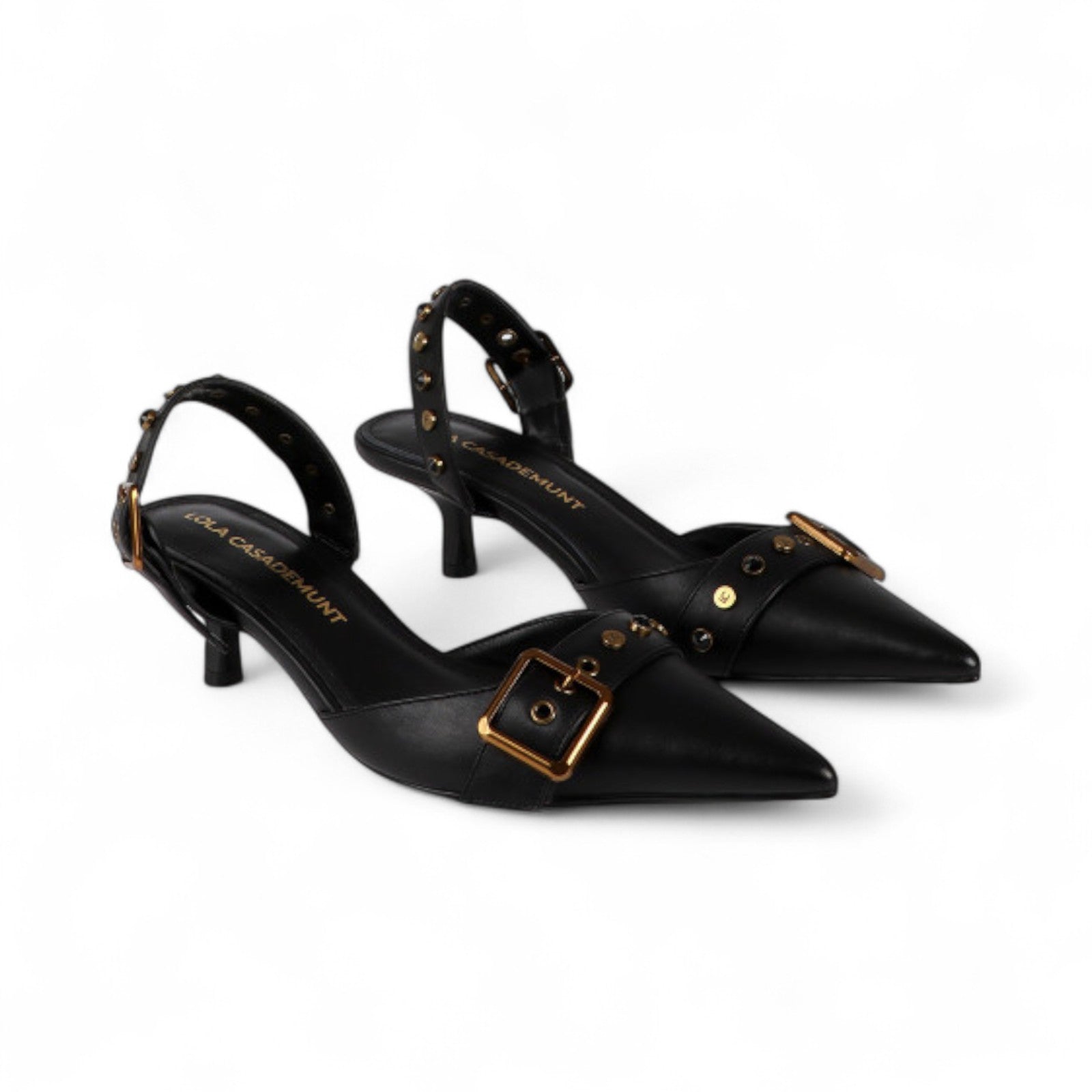 Elegante scarpa aperta con tacco medio realizzata in pelle nera. Fibbie e borchie dorate per un tocco moderno. Tacco da 5 cm.