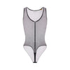 Body in tulle con trama a rete dalla vestibilità aderente. Con scollo all'americana, è impreziosito da dettagli in vinile che donano una silhouette definita e dal logo in metallo dorato su un lato.