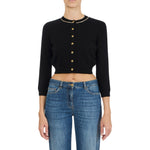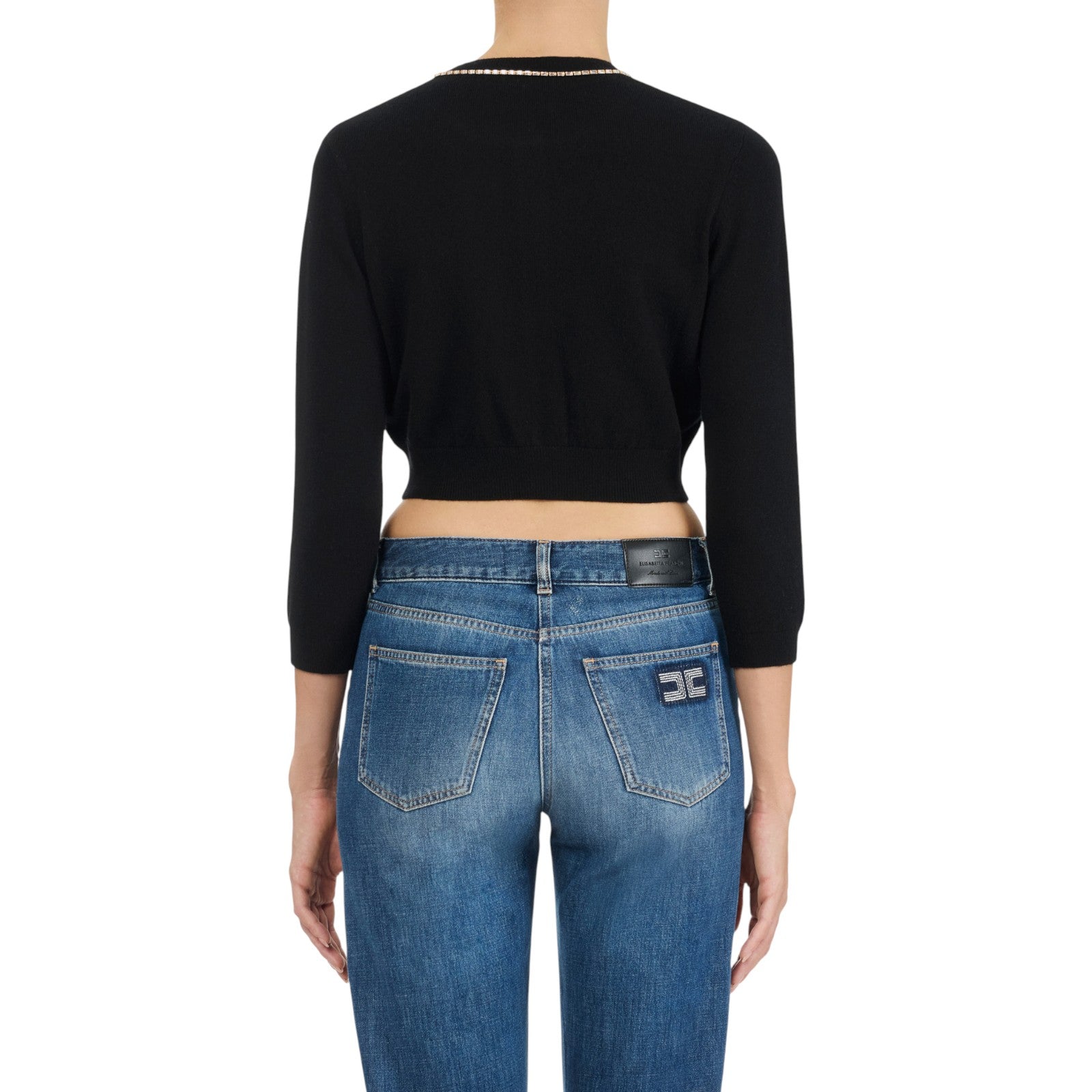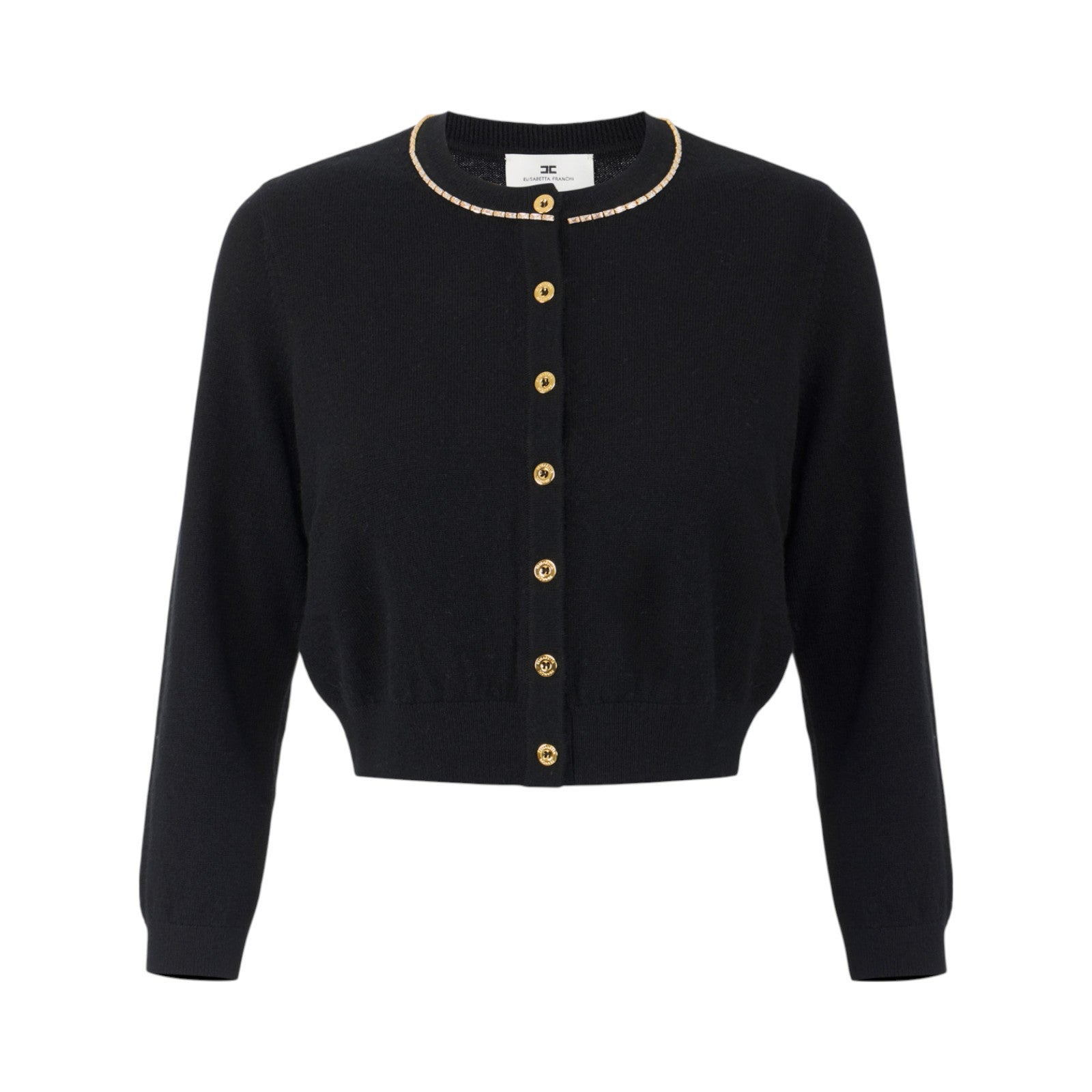 Cardigan a maniche ¾, realizzato in morbido filato di lana e cachemire. Una catena di strass è posizionata sullo scollo, la chiusura ha bottoni in metallo dorato per un mix di dettagli luminosi. Vestibilità aderente.