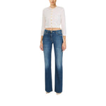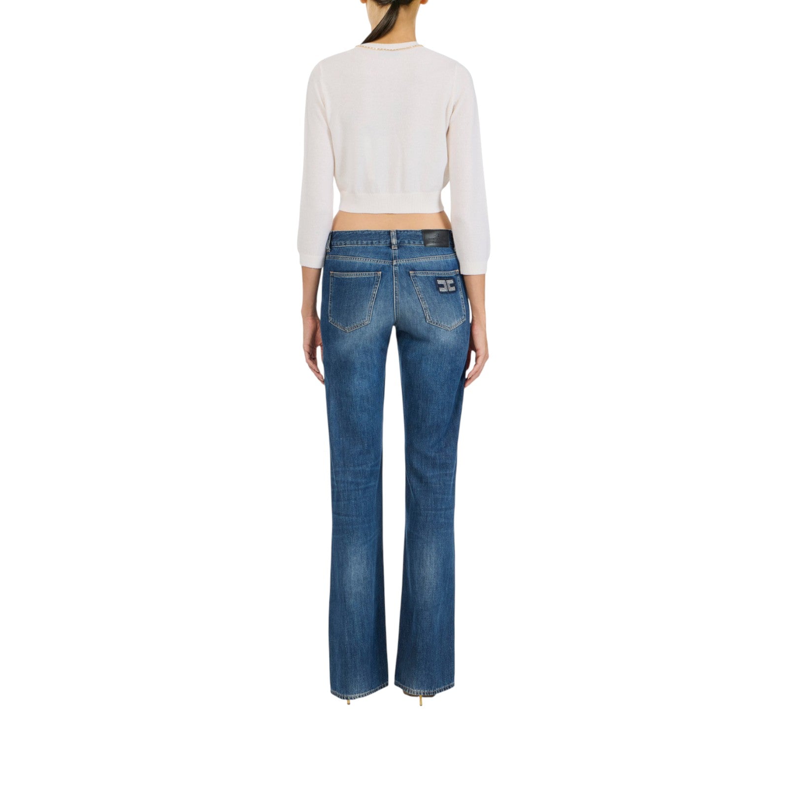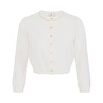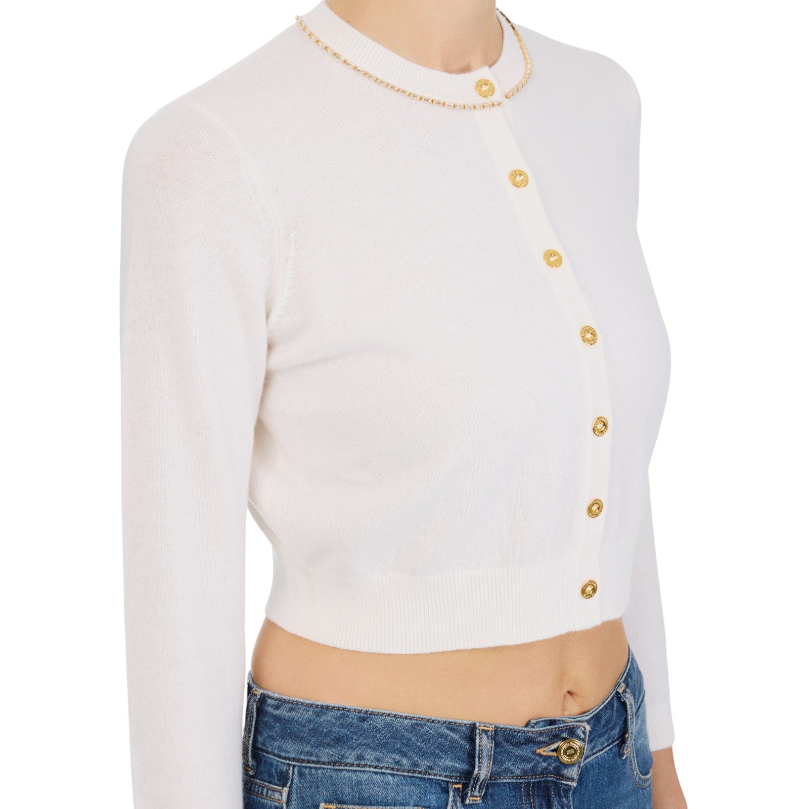 Cardigan a maniche ¾, realizzato in morbido filato di lana e cachemire. Una catena di strass è posizionata sullo scollo, la chiusura ha bottoni in metallo dorato per un mix di dettagli luminosi. Vestibilità aderente.