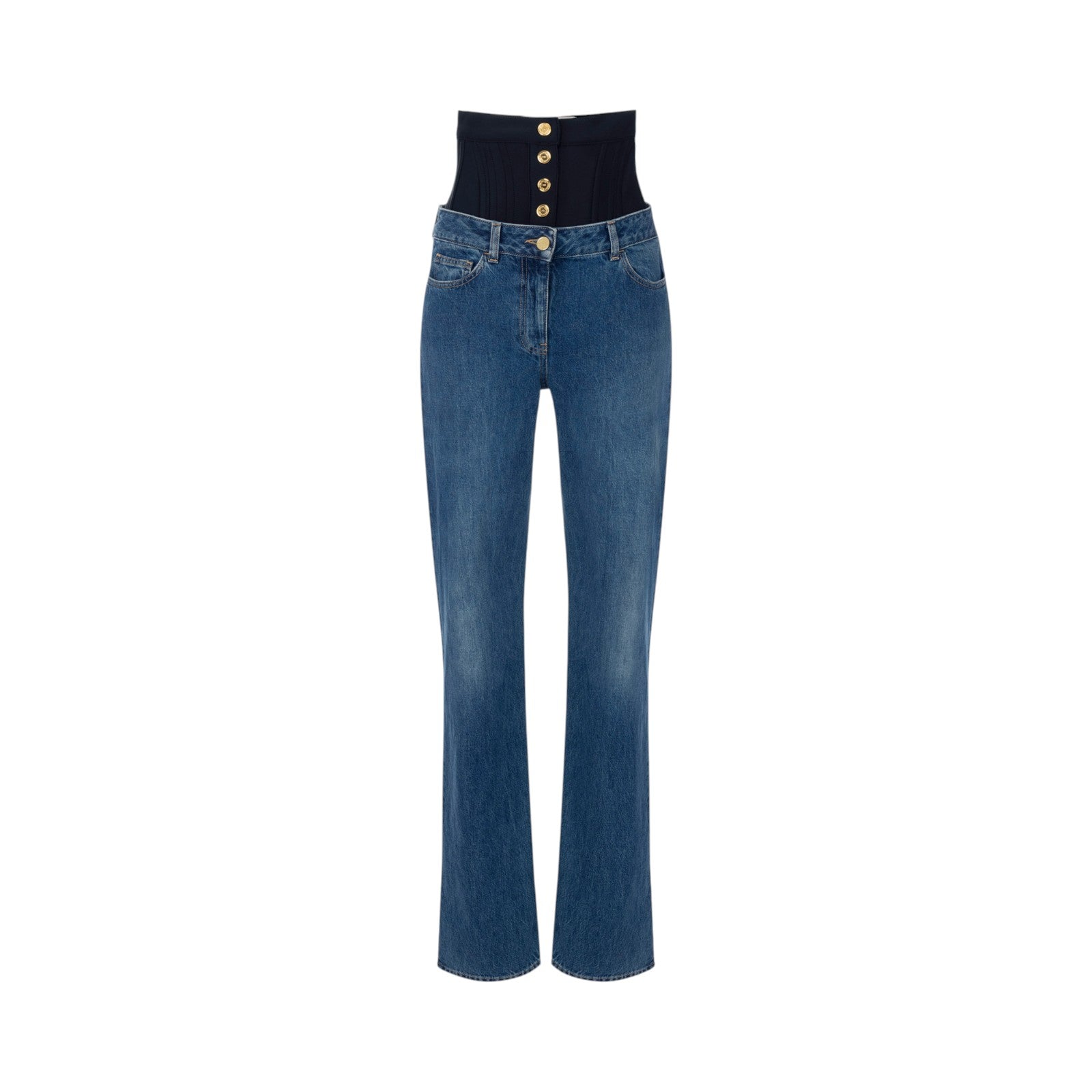 Pantaloni in denim con costruzione loose a cavallo basso. Si distinguono per la fascia in neoprene che sormonta la vita, definita da tagli di ispirazione bustier e illuminata da bottoni in metallo dorato. L'etichetta e la placca con logo sul retro completano il capo. Vestibilità over.