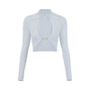 Maglia crop a costine dalla vestibilità aderente. Con colletto a camicia e maniche lunghe, si distingue per l'ampio scollo trattenuto dal morsetto gioiello con logo e strass. La trama è ingentilita dai ricami à jour che regalano definizione e morbidezza.
