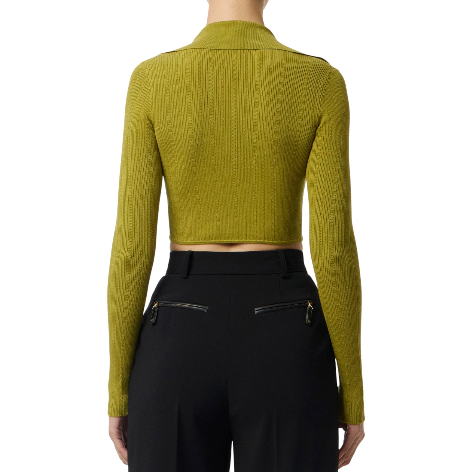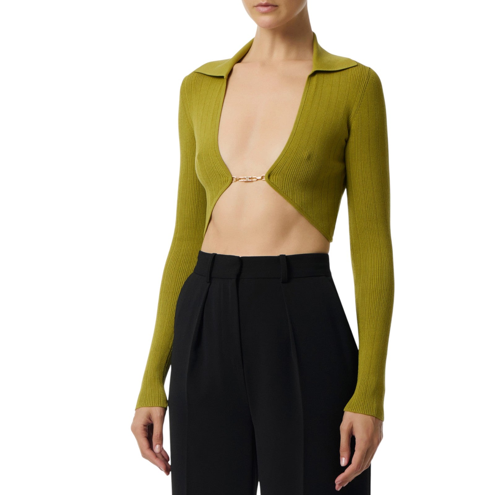 Maglia crop a costine dalla vestibilità aderente. Con colletto a camicia e maniche lunghe, si distingue per l'ampio scollo trattenuto dal morsetto gioiello con logo e strass. La trama è ingentilita dai ricami à jour che regalano definizione e morbidezza.