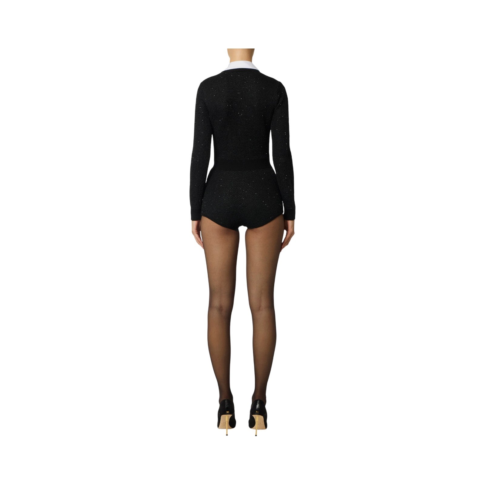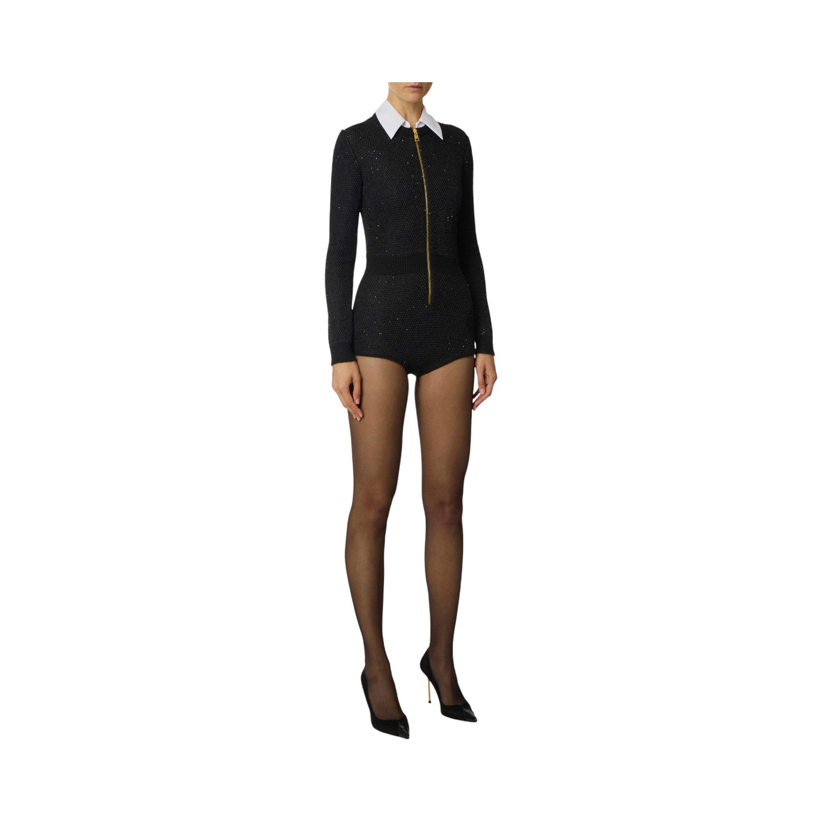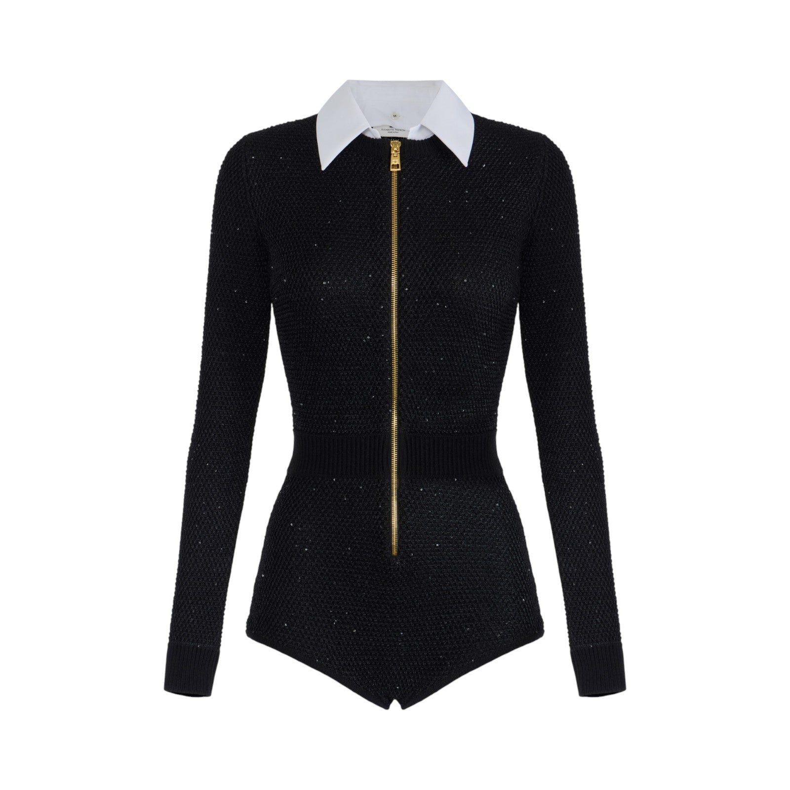 Tuta in maglia dalla vestibilità aderente. Si distingue per la texture con paillettes in trama, a donare riflessi preziosi. Rifinita con vita lavorata a costine, ha colletto a camicia realizzato in popeline e amovibile per più styling. La zip in metallo dorato aggiunge un'ultima nota luminosa.
