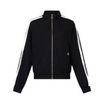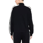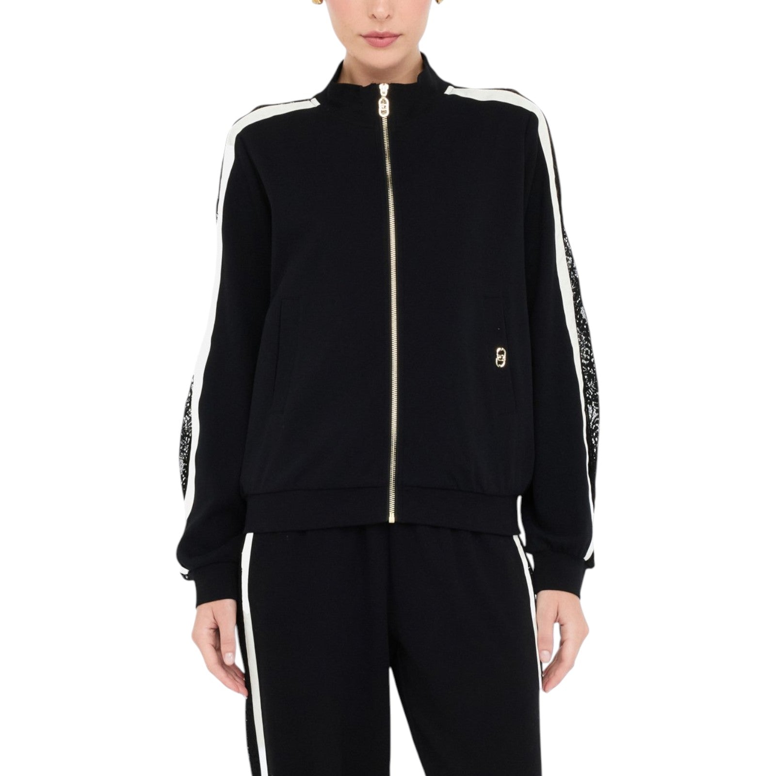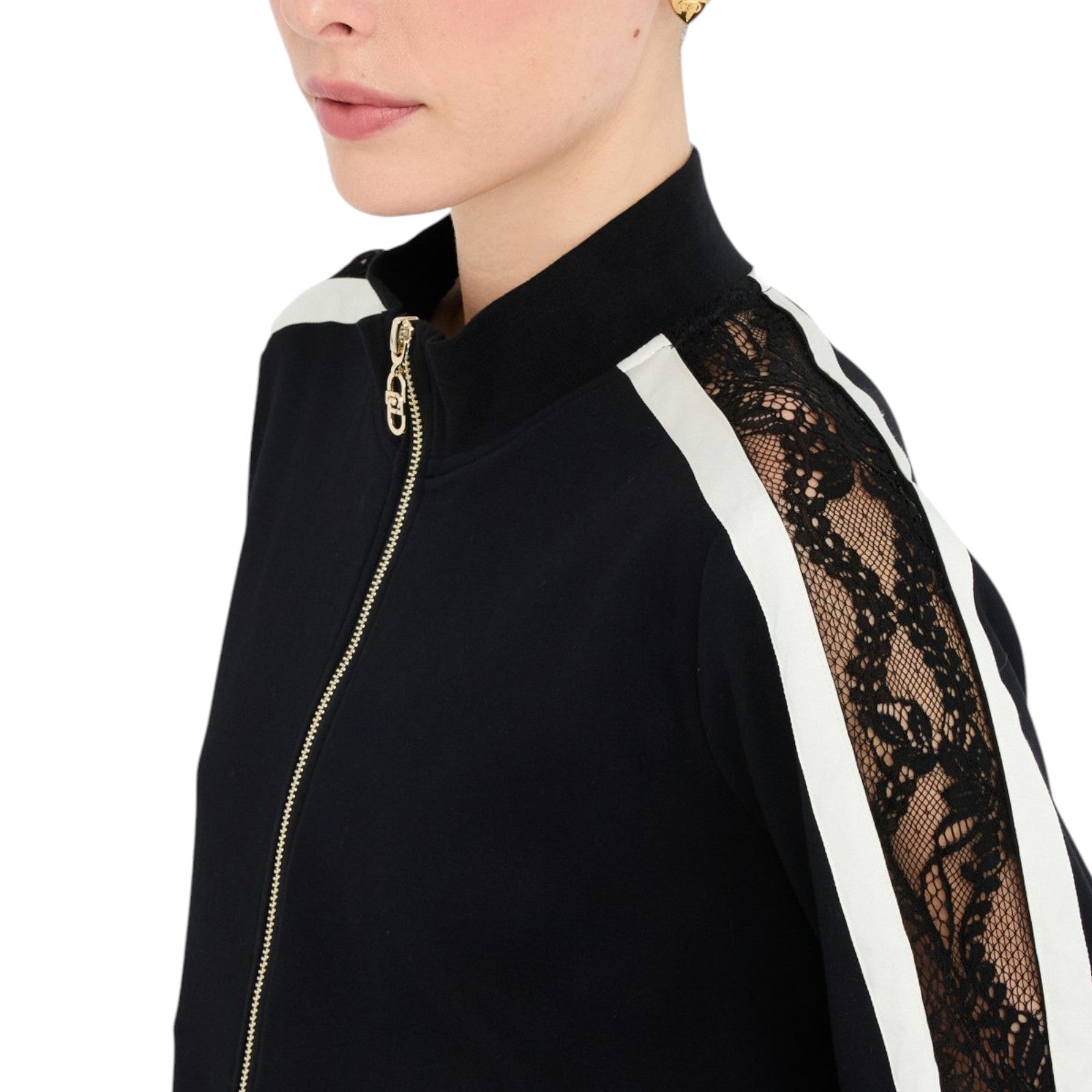 Felpa nera. Realizzata in interlock di cotone stretch. Bande laterali a contrasto con dettaglio in pizzo. Collo alto. Tasche sui lati. Logo in metallo. Tirazip logata.