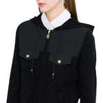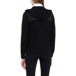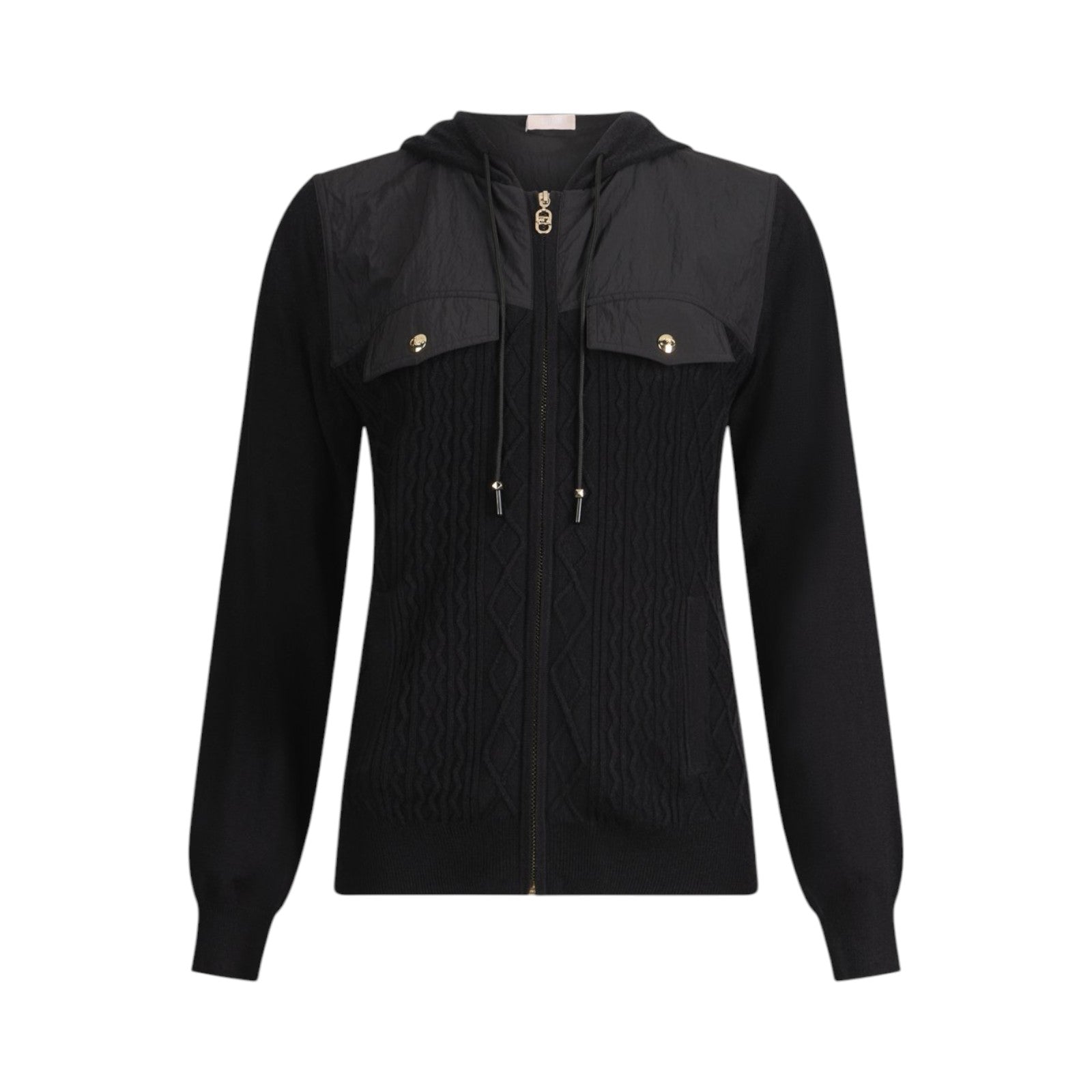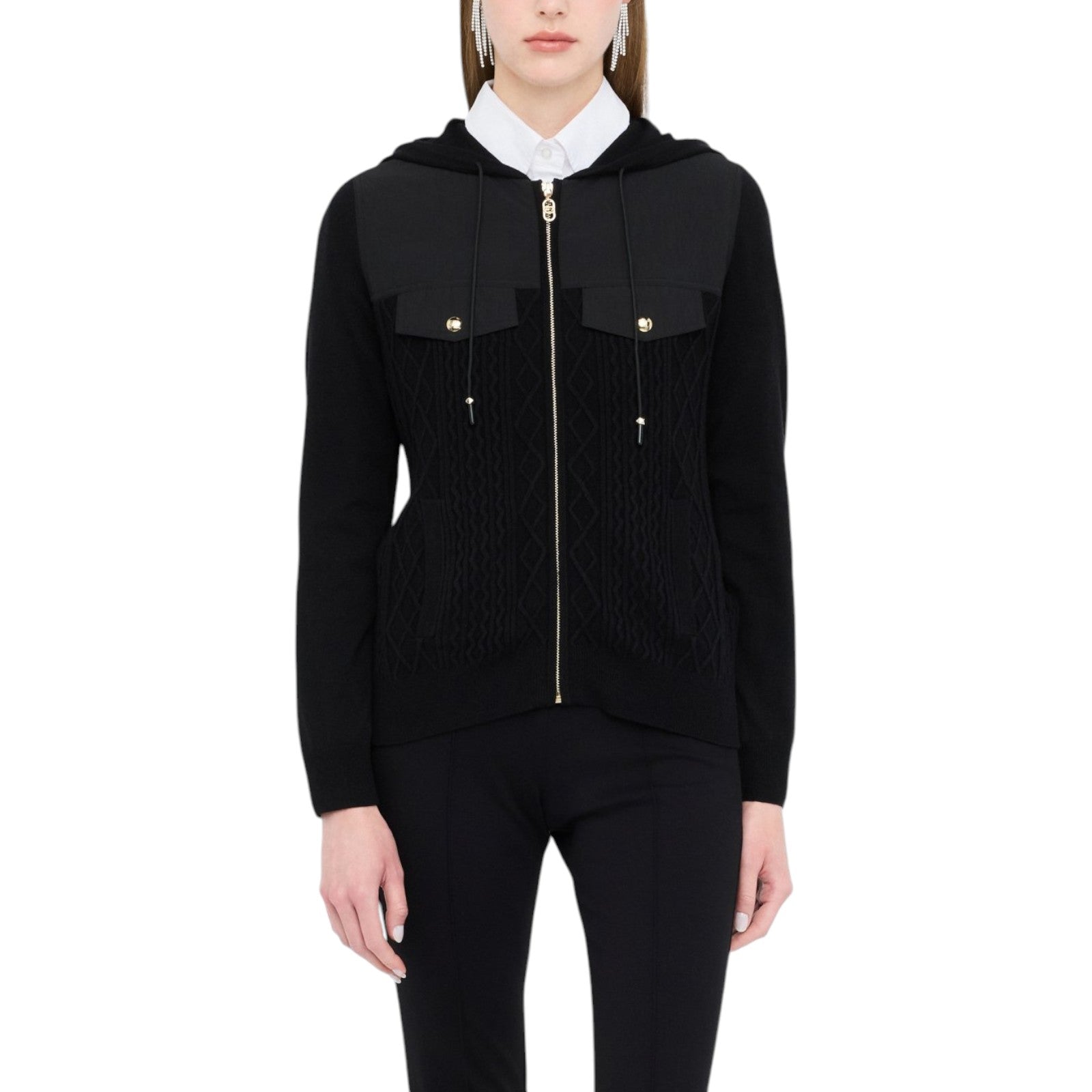 Felpa in misto viscosa nera. Lavorazione grafica. Cappuccio con coulisse. Taschini con patta e bottone. Tasche sui lati. Bordi a costine. Logo in metallo sul retro. Tirazip logata. Chiusura con zip. Prodotto "Liu Jo Better".