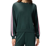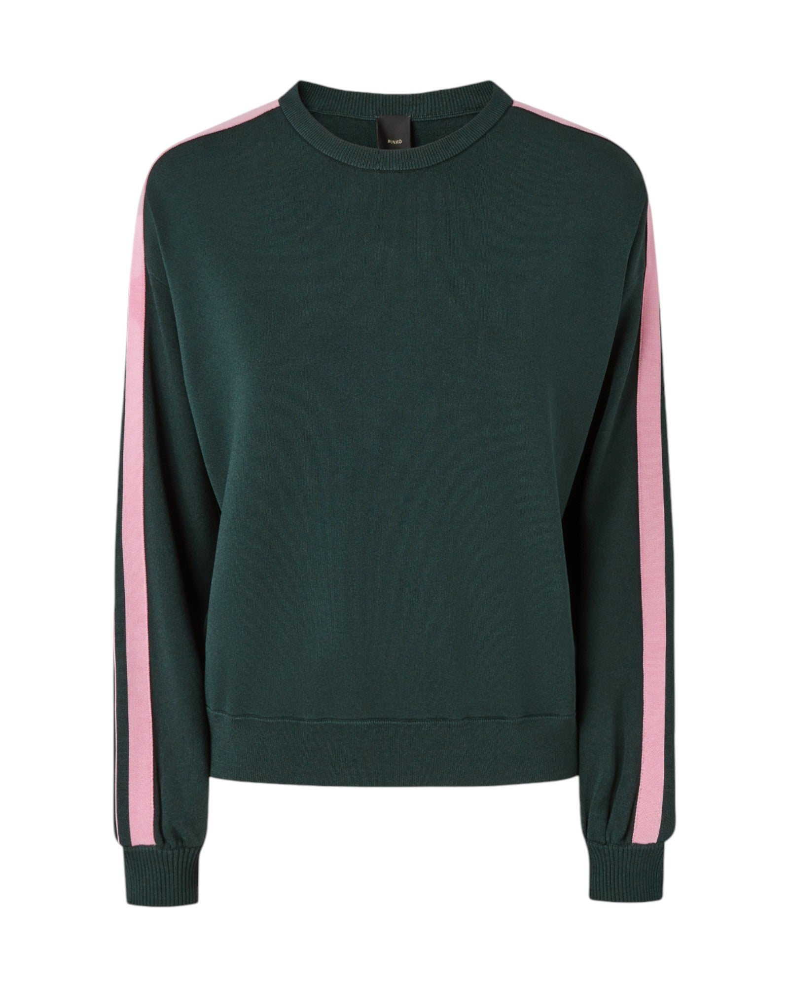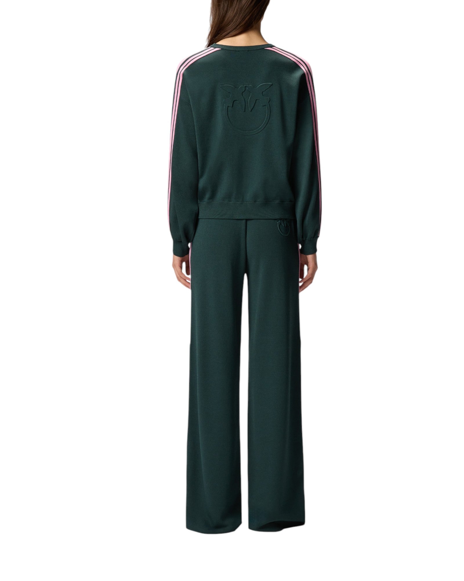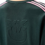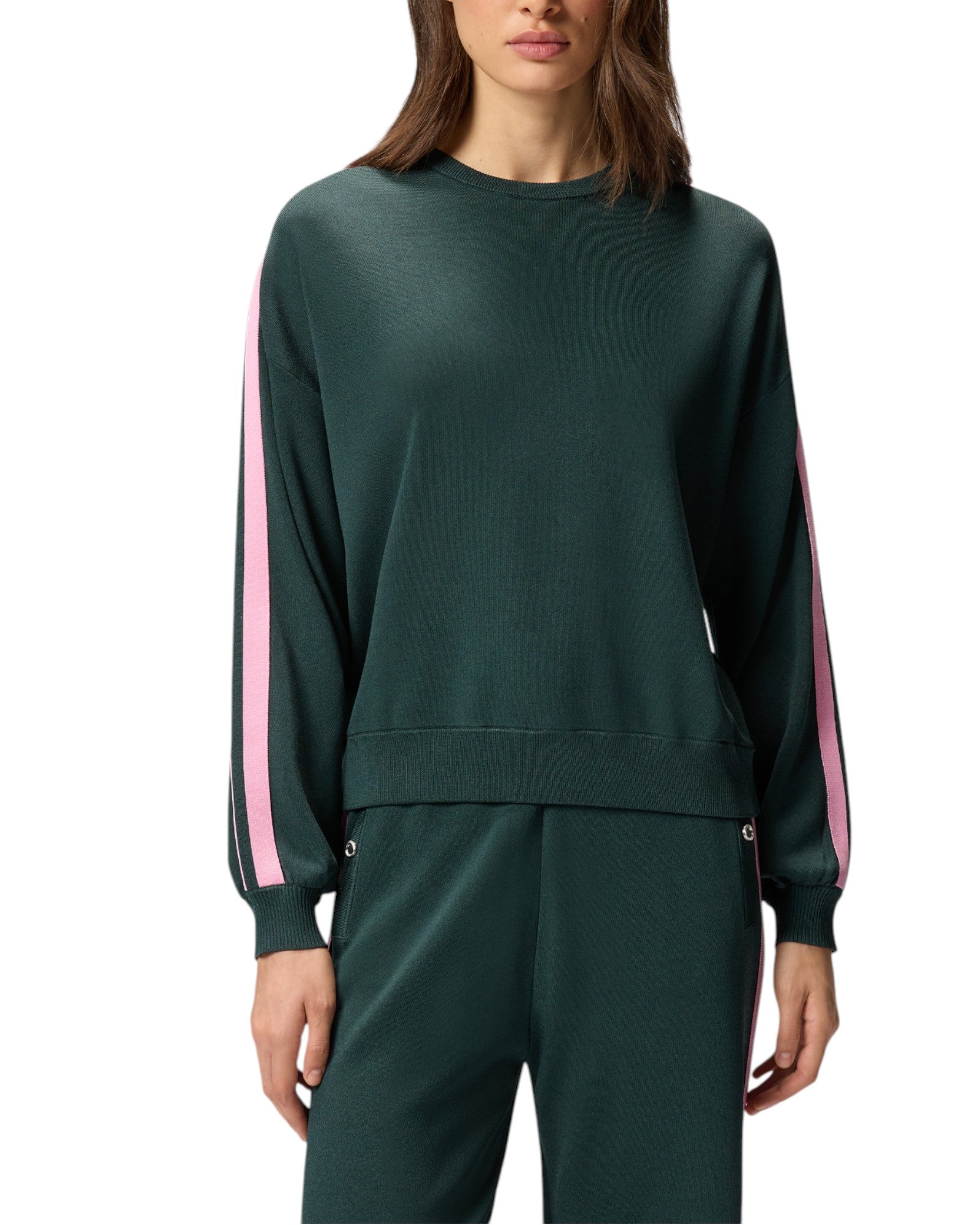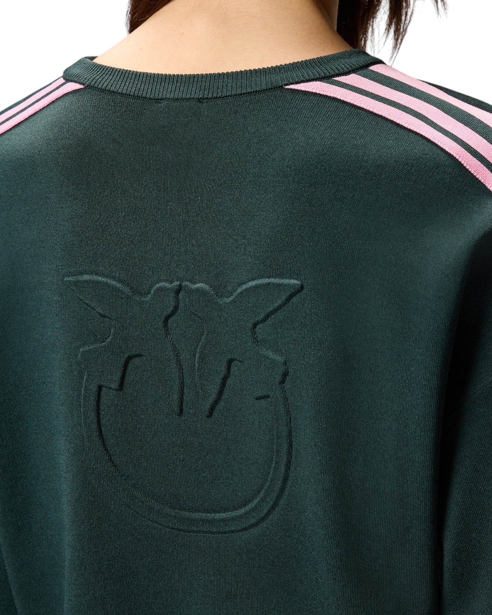 Felpa girocollo sportiva a maniche lunghe, realizzata in piquet effetto felpa tecnica, profilata con bande laterali a contrasto. Girocollo, orlo e polsini sono elasticizzati e lavorati a coste, mentre il tocco finale è dato dal maxi logo Love Birds impresso sul retro.
