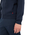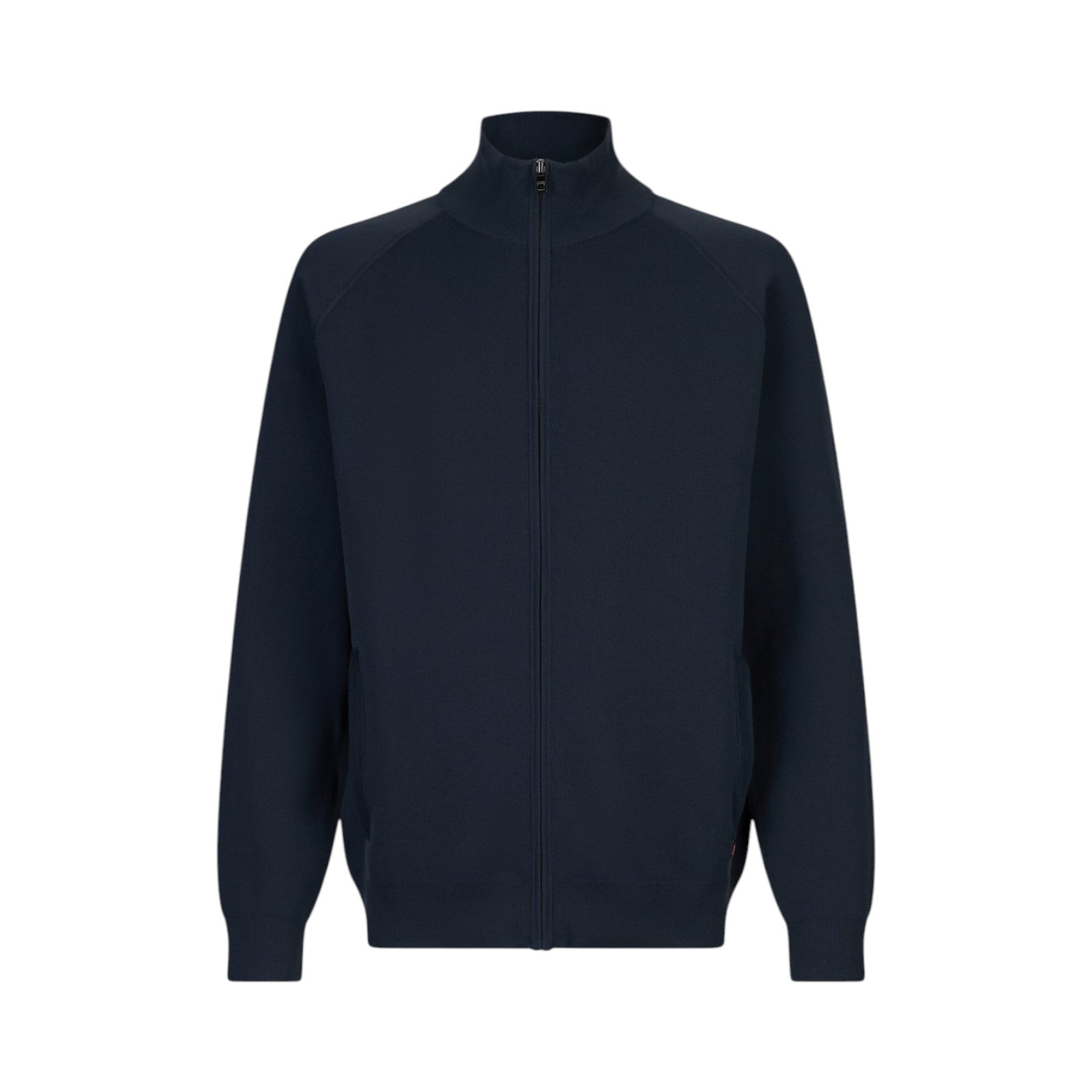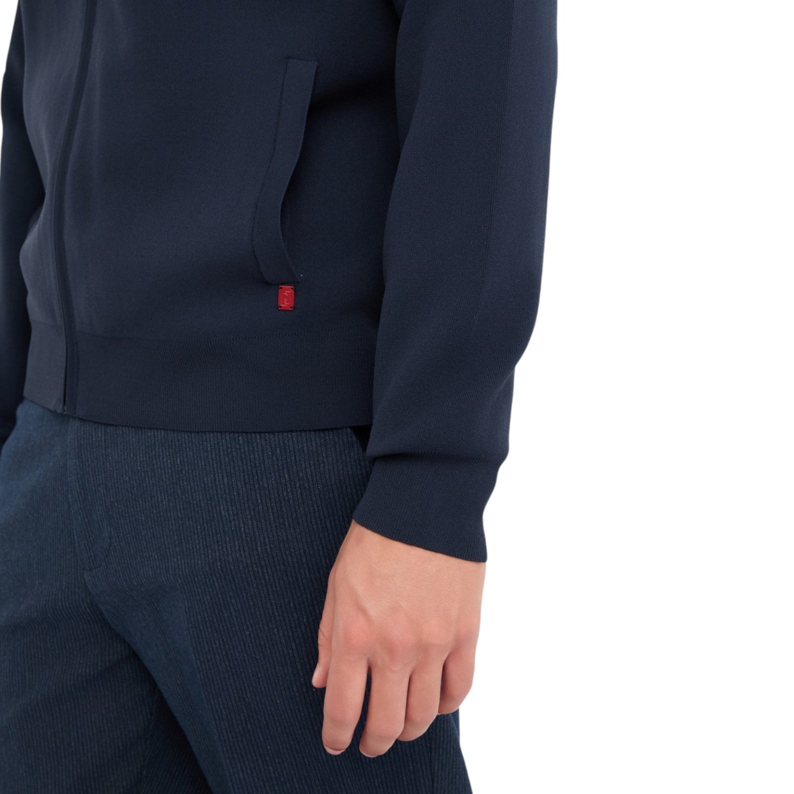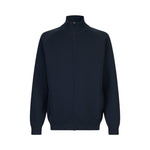 Cardigan blu. Realizzato in maglia di misto cotone stretch. Collo alto. Maniche lunghe raglan. Tasche sui lati. Logo al fondo. Bordi a costine. Chiusura con zip.
