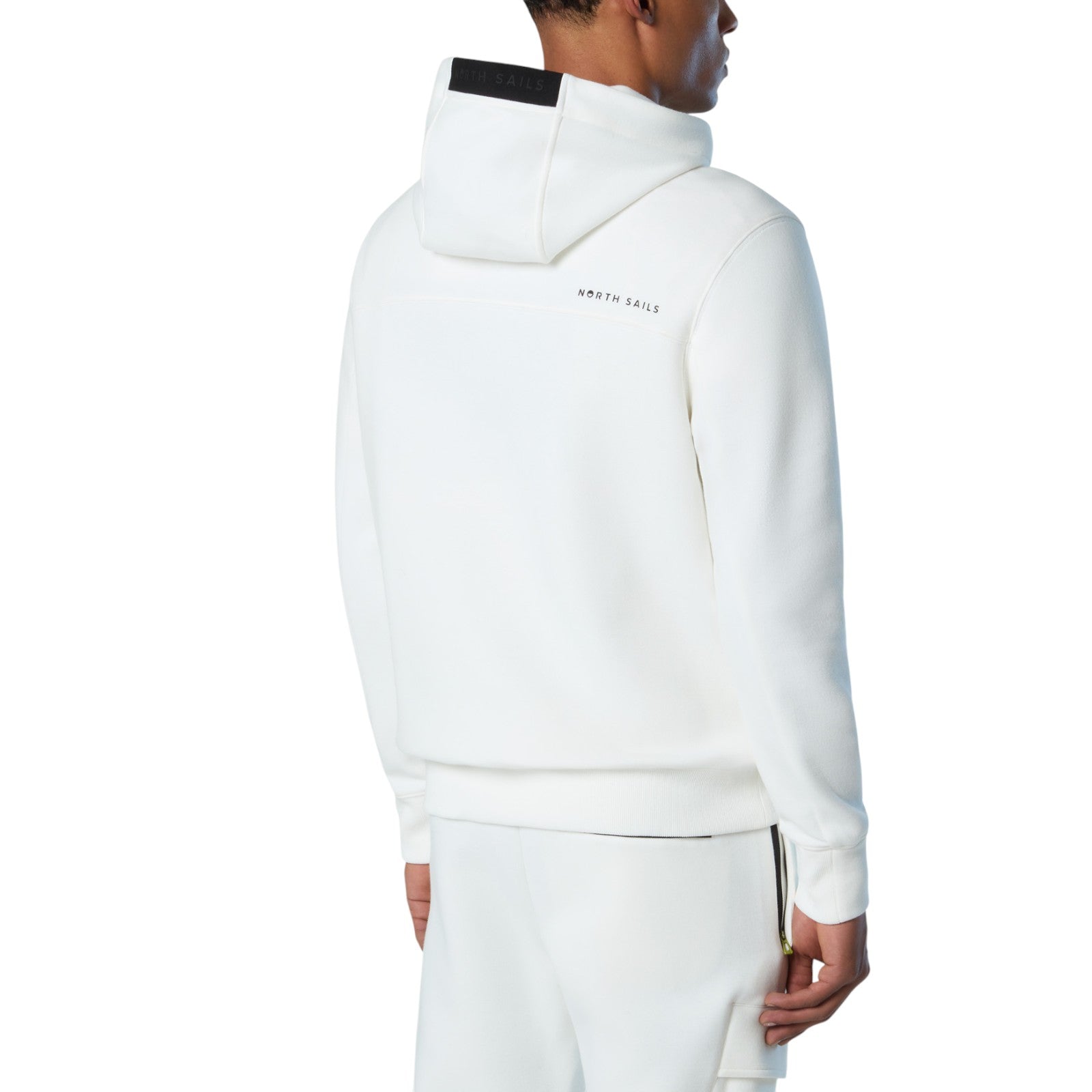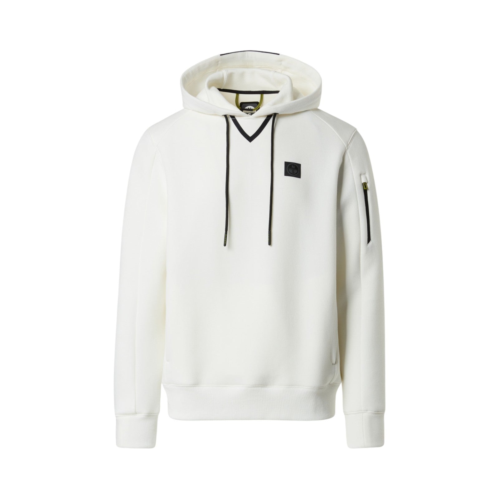 Realizzato in scuba di poliestere riciclato. Lavorazione piquet. Vestibilità regolare. Cappuccio con coulisse. Cuciture ergonomiche. Tasche sui lati. Tasca con zip impermeabile sulla manica. Polsini e fondo a costine. Stampa North Sails gommata sul retro. Patch North Tech sul petto.