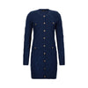 Abito corto blu. Realizzato in maglia di misto lana. Lavorazione a trecce. Scollo rotondo. Maniche lunghe. Taschini e tasche con bottone dorato. Bordi a coste. Chiusura con bottoni dorati logati.