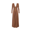 Abito da sera in jersey lurex dalla vestibilità aderente. Il vestito ha spalle strutturate con scollo profondo, maniche lunghe e gonna plissé con spacchi laterali. Si distingue per i drappeggi che incorniciano il busto e il punto vita. Dettaglio gioiello amovibile, in catena con logo e nappine.