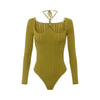 Body in maglia dalla vestibilità aderente ed elastica. Lo scollo sagomato lascia le spalle scoperte ed è impreziosito dal dettaglio gioiello con logo trattenuto con laccio da annodare. Le lavorazioni a costine e i dettagli à jour donano morbidezza e definizione a tutta la lunghezza.