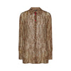 Camicia maschile dalla linea diritta, in georgette stampata, con dettagli a contrasto e bottoni foderati. Carré e piega al centro dietro, linea dritta. La modella è alta 178 cm e indossa la taglia 44IT.