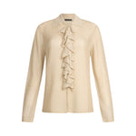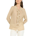 Camicia in maglia di misto viscosa e lurex®. Lavorazione a costine. Maniche lunghe. Rouches. Chiusura con bottoni.