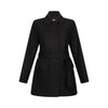 Cappotto nero in panno double. Filati in misto lana. Colletto. Tasche a filetto sul petto. Tasche con patta. Cintura in tono colore. Chiusura con bottoni.