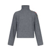 Dolcevita in maglia. Filati in lana. Lavorazione a trecce. Bottoni gioiello sulla spalla.