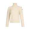 Dolcevita in maglia. Filati in lana. Lavorazione a trecce. Bottoni gioiello sulla spalla.