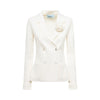 Giacca blazer in maglia di pura lana jacquard punto felpa, effetto lana cotta morbida. ha linea dritta, chiusura con bottoni ricoperti e i primi logati, tasche applicate, spilla a rosa rimovibile all'occhiello.