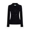 Giacca blazer in maglia di pura lana jacquard punto felpa, effetto lana cotta morbida. ha linea dritta, chiusura con bottoni ricoperti e i primi logati, tasche applicate, spilla a rosa rimovibile all'occhiello.