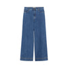 Jeans 5 tasche dalla vestibilità morbida con gamba larga. Jeans in denim di puro cotone trattato in capo. Chiusura con zip coperta e bottone a chiodo. Impuntura alta al fondo. Rivetti in metallo e cuciture a contrasto.