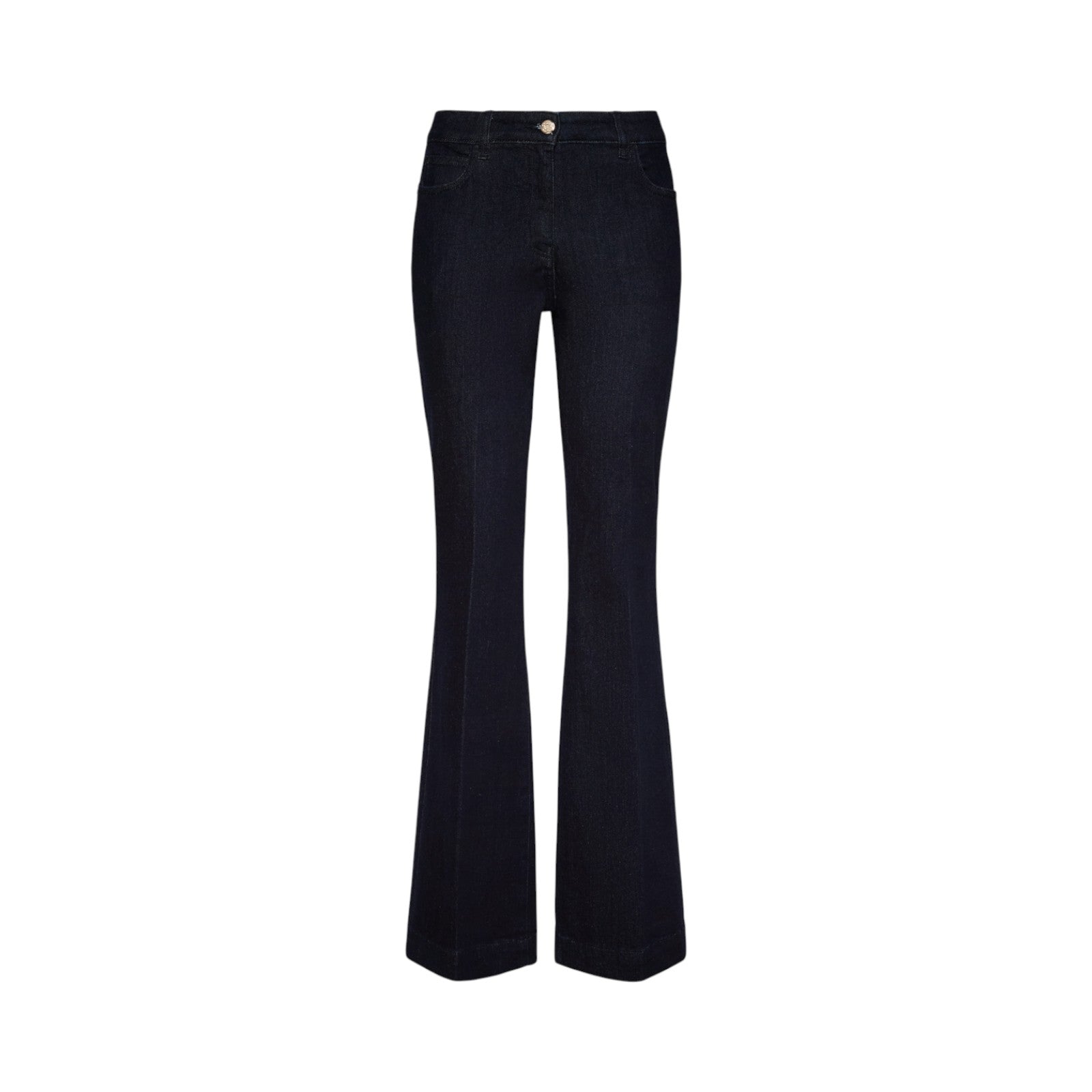 Jeans tailoring flare in denim stretch dark blu. Modello 5 tasche, con chiusura davanti. Gamba svasata, piega stirata.