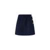 Minigonna con linea a trapezio realizzata in tessuto bouclé di misto cotone e lana. Il capo presenta un orlo dritto, pinces sul retro per migliorare la vestibilità e una chiusura a portafoglio impreziosita da tre bottoni in metallo decorati da stella.
