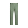 Pantaloni chino verdi. Realizzati in raso di cotone stretch. Piega stirata. Tasche sui fianchi. Tasche a filetto sul retro. Chiusura con bottone e zip coperta.