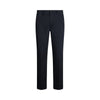 Pantaloni chino blu. Realizzati in raso di cotone stretch. Piega stirata. Tasche sui fianchi. Tasche a filetto sul retro. Risvolto al fondo. Chiusura con bottone e zip coperta.