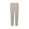 Pantaloni beige. Realizzati in misto lana stretch. Pinces e piega stirata. Tasche sui fianchi. Tasche a filetto sul retro. Chiusura con bottone e zip coperta.