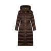Piumino lungo marrone in nylon trapuntato. Imbottitura in vera piuma. Comodo cappuccio. Tasche con patta. Cintura in tono colore. Chiusura con zip e bottoni a pressione logati.