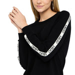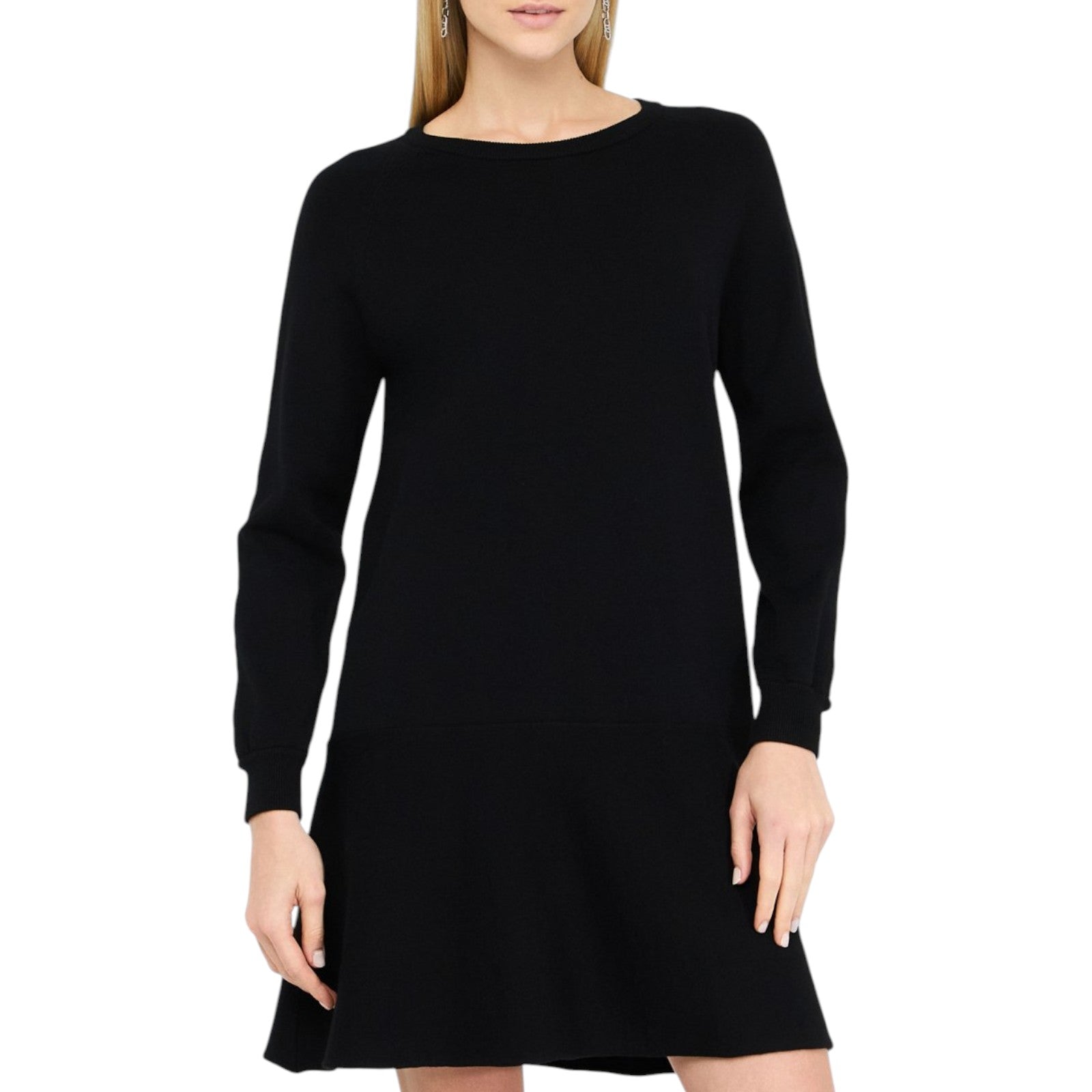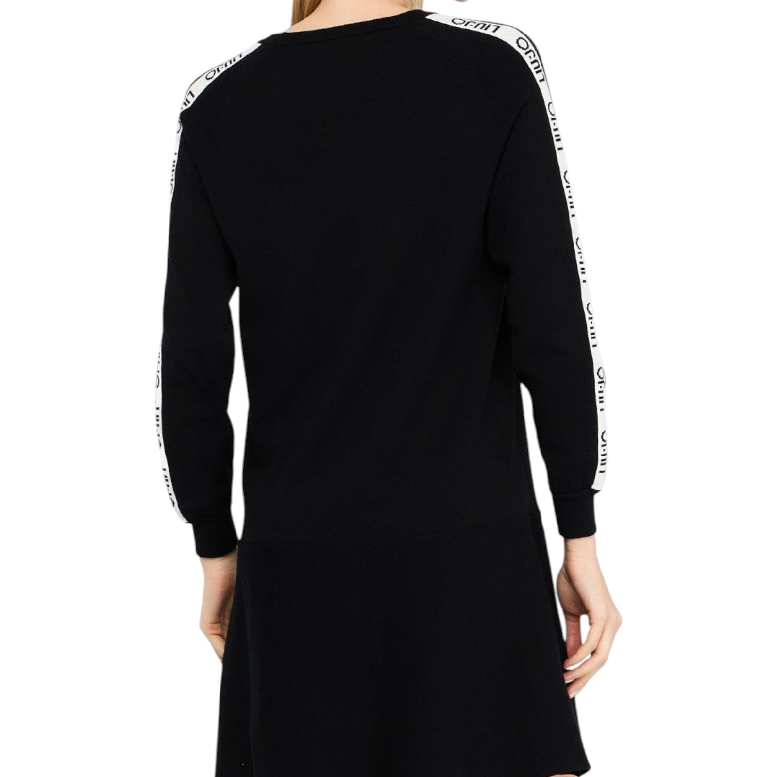 Abito corto in maglia di misto viscosa. Logo jacquard sulle maniche. taglio girocollo. Maniche lunghe raglan. La modella è alta 180 cm e indossa la taglia S.