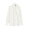 Blusa in popeline di puro cotone. Linea ampia. Collo alto con fusciacche annodate. Maniche ampie raglan a sbuffo. Polsini alti a camicia con doppio bottone. Chiusura con asole e bottoni ricoperti sul taglio raglan sinistro.
