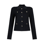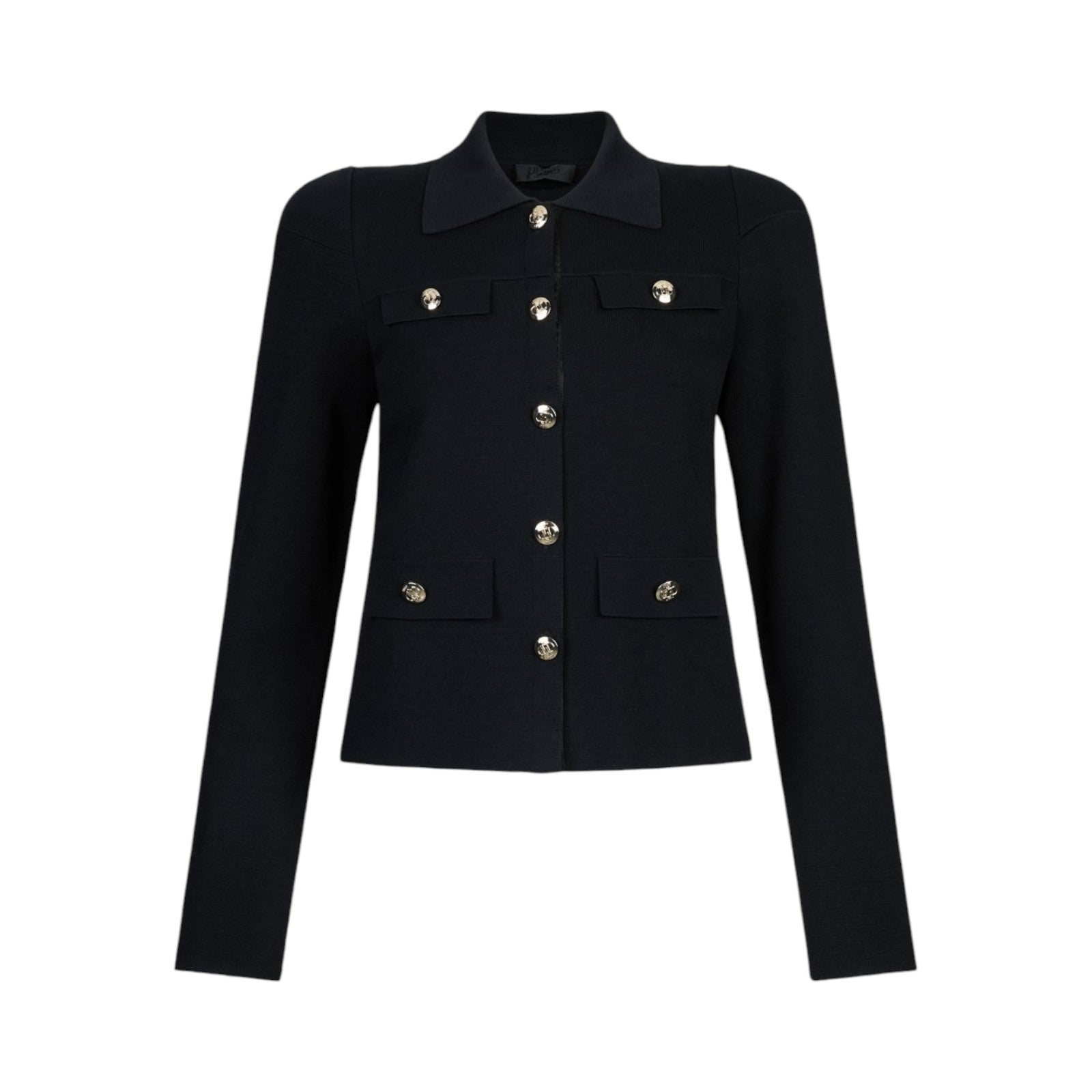 Giacca verde. Realizzata in maglia di misto viscosa. Collo a camicia. Taschini con patta e bottone dorato. Tasche con patta e bottone dorato. Chiusura con bottoni dorati logati. La modella è alta 177 cm e indossa la taglia S.