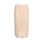 Gonna longuette in pizzo. Cintone elastico in vita. Fodera interna.