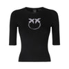 Maglia aderente a mezze maniche in lana merino lavorata a costine dalla mano particolarmente leggera, caratterizzata da un intarsio con logo Love Birds in trasparenza sul davanti.