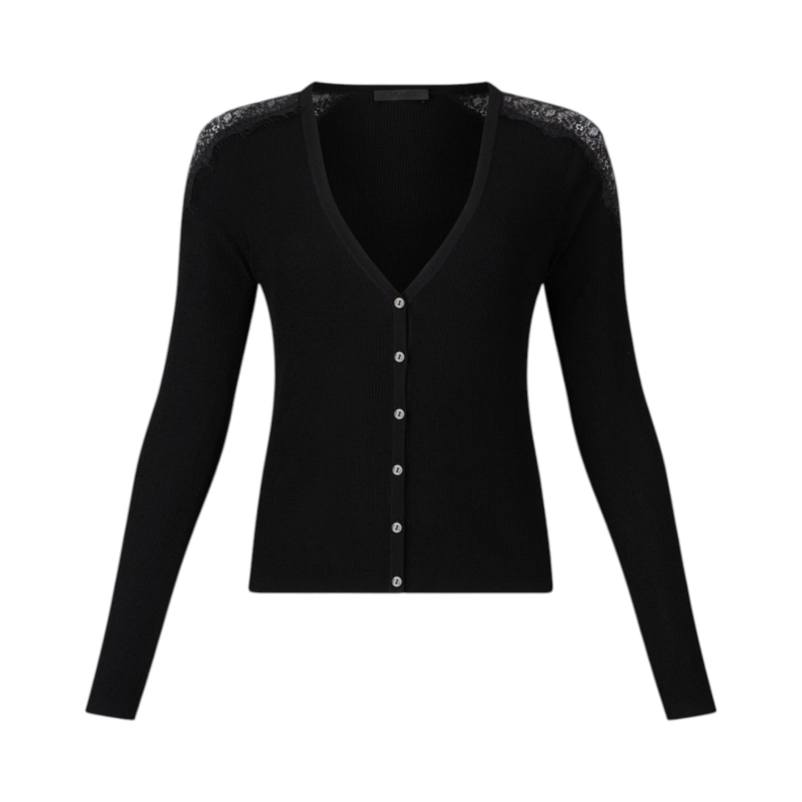 Cardigan nero. Realizzato in maglia di misto viscosa. Dettagli in pizzo. Lavorazione a costine. Scollo a V. Maniche lunghe. Logo in metallo sul retro. Chiusura con bottoni. La modella è alta 181 cm e indossa la taglia S.